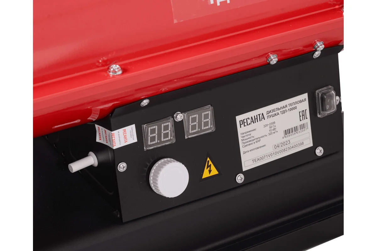 Ресанта ТДП-10000 относится к приборам с прямым типом нагрева. Промышленный вентилятор с производительностью 320 м³/час прогоняет воздух сквозь пламя горелки. Температура выходящего воздуха достигает 800 градусов. Продукты горения отводятся вместе с воздухом. Поэтому дизельные тепловые пушки рекомендовано использовать в нежилых помещениях с качественной вентиляцией.