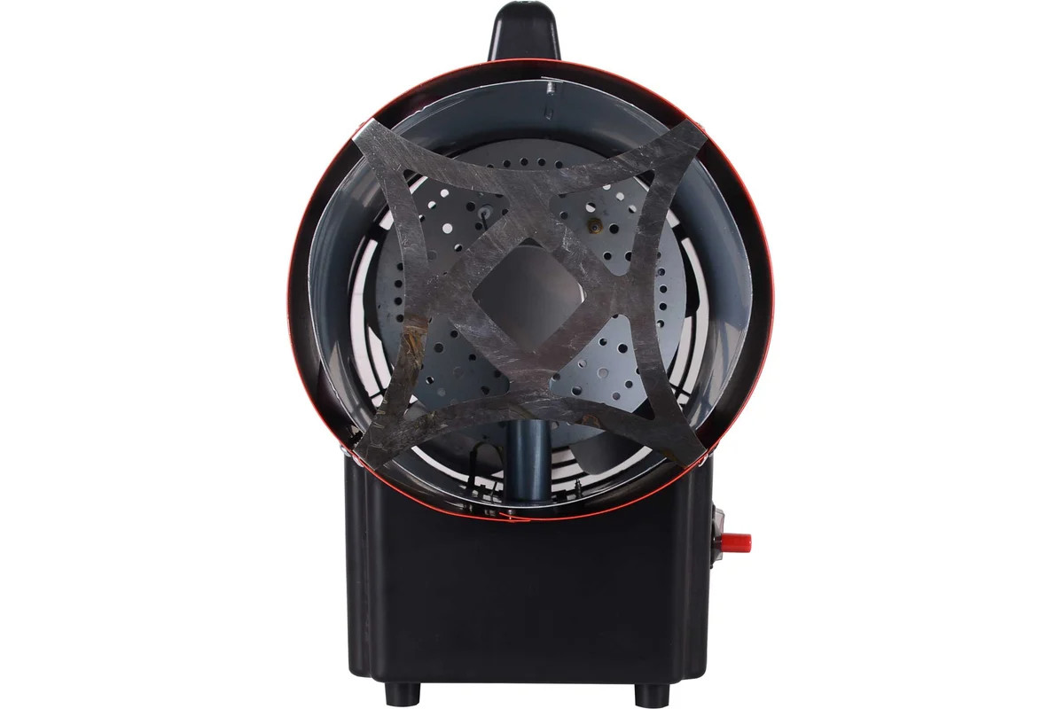 Газовая тепловая пушка оснащена шлангом для подключения баллона с топливом. Конструкцией предусмотрено наличие ручки для удобного перемещения устройства по помещению и защитного кожуха на кнопке включения/выключения.