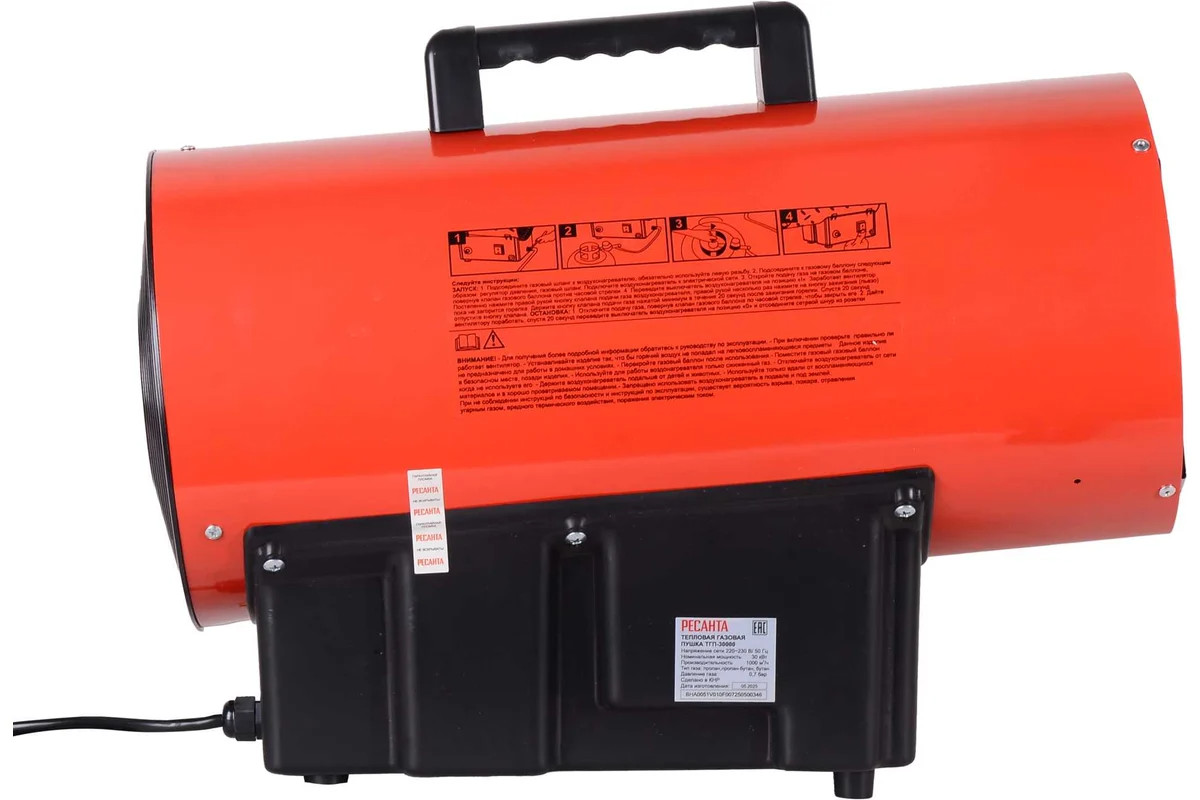 Ресанта ТГП-30000 оснащена пьезоэлектрическим розжигом, что является безопасным и надежным методом запуска. Газовая теплопушка создает давление 0,7 бар. Система отслеживает состояние нагрева и при критическом превышении температуры отключает прибор во избежание поломки и возникновения пожара. Контроль пламени происходит с помощью встроенного биметаллического датчика. При угасании подача топлива прекращается.