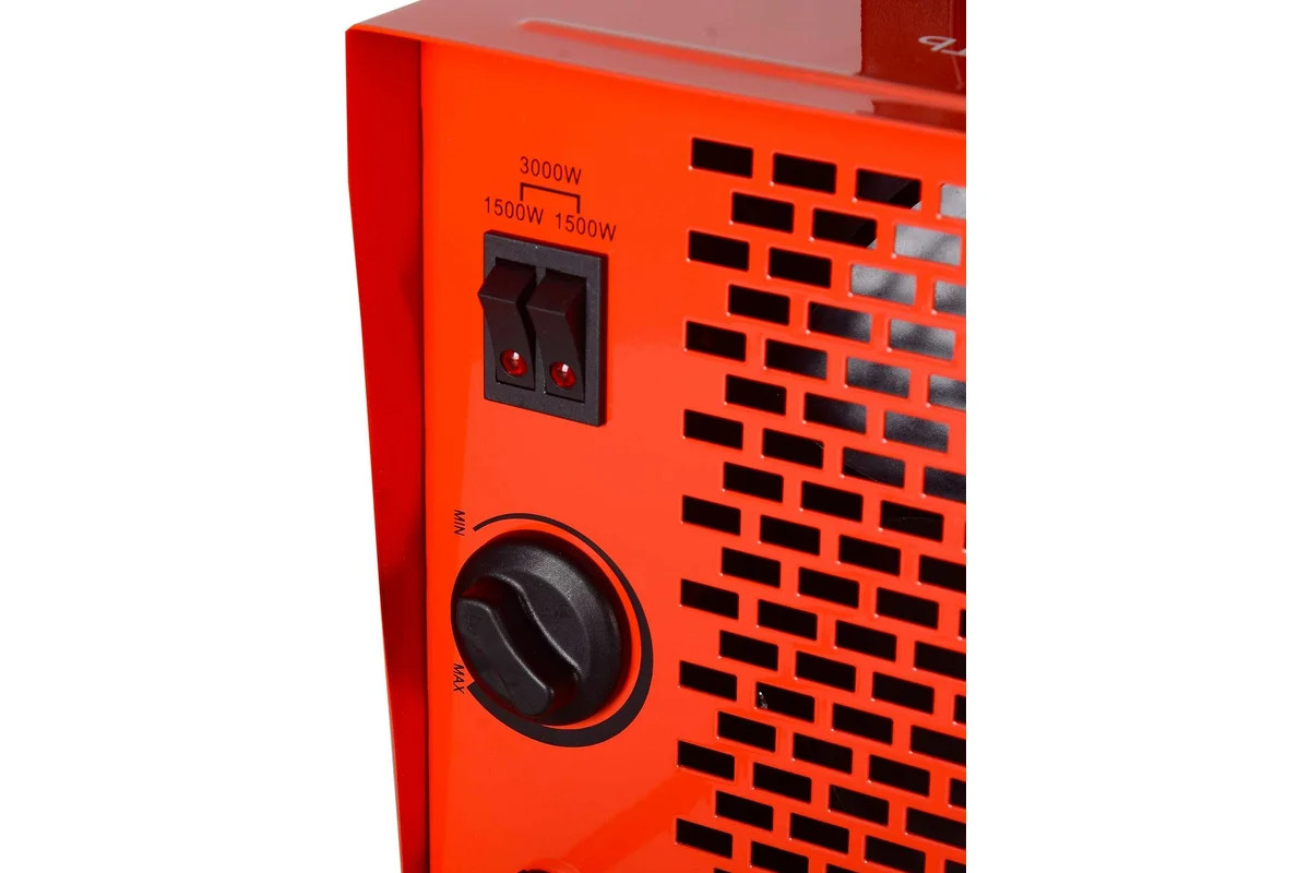 Тепловая пушка квадратной формы, корпус которой выполнен из прочного и устойчивого к коррозии металла, оснащена ручкой для удобства транспортировки. Её можно переносить между помещениями и использовать в нескольких режимах, в половину силы - мощностью в 1500 Вт, или в полную силу - 3000 Вт. Настройки легко задать при помощи кнопок и поворотной ручки термостата на корпусе.