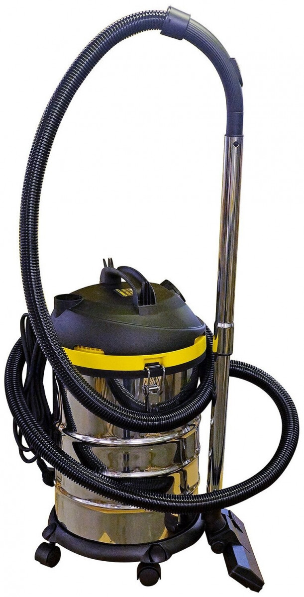 Бак для сбора мусора имеет объем 30 литров и изготовлен из нержавеющей стали. Такая конструкция позволяет работать с различными жидкостями, влажными отходами, твердыми и крупными кусками мусора без ущерба для агрегата. В верхней части пылесоса находится дополнительная розетка, к которой можно подключать электроприборы с диапазоном мощностей от 100 до 2000 Вт. Благодаря такому решению запуск пылесоса можно синхронизировать со стартом основного агрегата. Для удобства транспортировки пылесос снабжен колесами, обеспечивающими максимальную легкость передвижения. Преимущества: