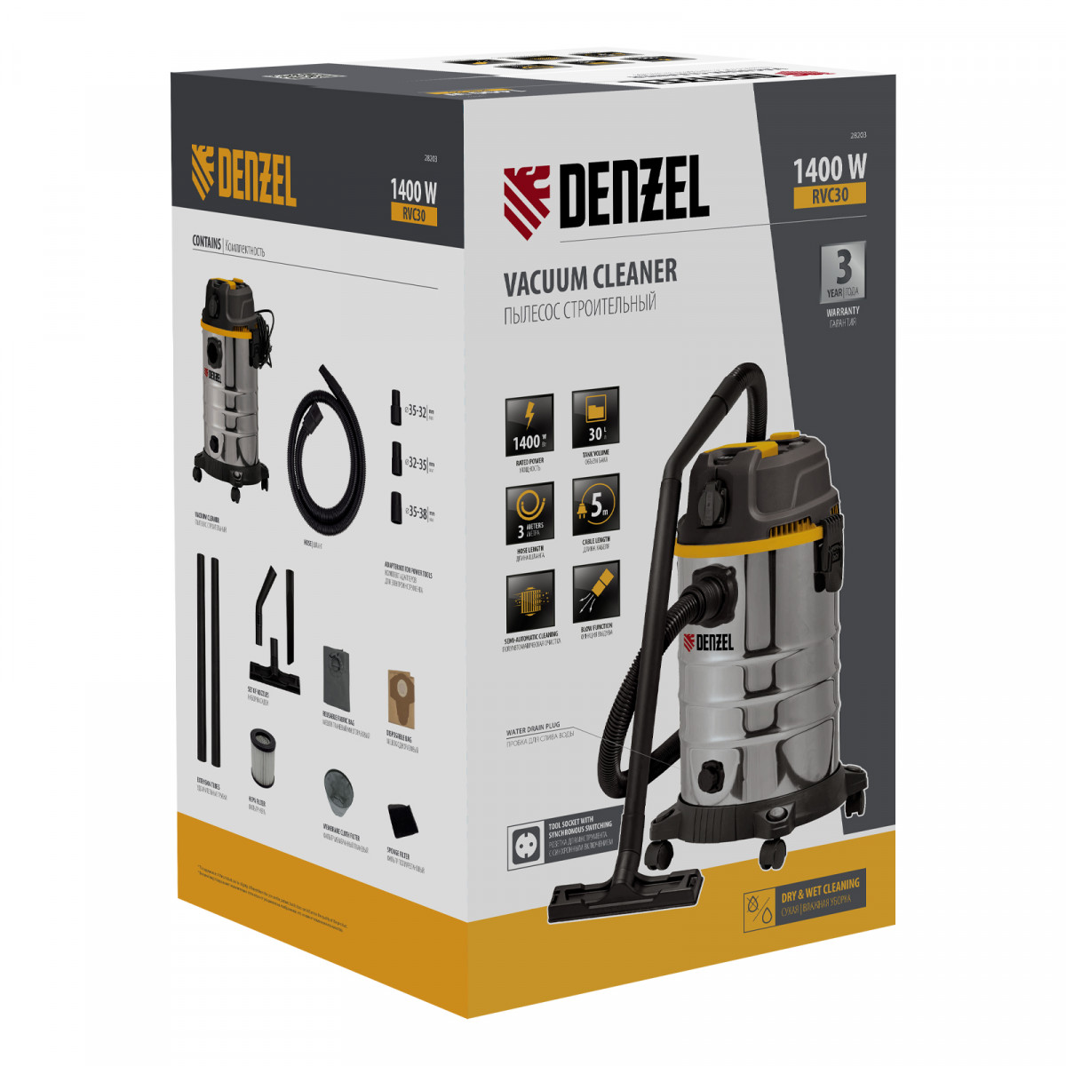 Пылесос строительный Denzel RVC30 28203 мощностью 1400 Вт, с баком объемом 30 л и шлангом длиной 3 м, оснащен розеткой с автосинхронизацией и предназначен для уборки бетонной, кирпичной пыли, опилок, стружки, также предусмотрена функция сбора воды. К пылесосу можно подключить электроинструмент, чтобы минимизировать количество пыли, образующейся в результате пиления, сверления, фрезерования. Техника используется во время проведения строительных и ремонтных работ, будет полезна для поддержания чистоты в мастерской, гараже, производственном помещении.