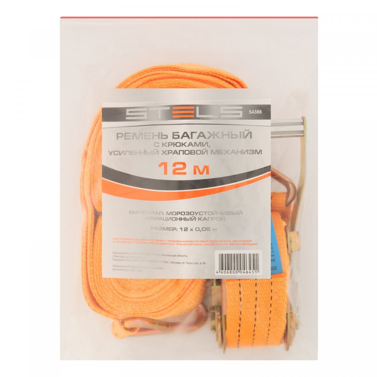 Багажный ремень с крюками Stels 54388 шириной 5 см и длиной 12 м, с храповым механизмом, предназначен для фиксации грузов на решетчатых конструкциях, например, открытых автомобильных багажниках, а также в прицепах. Пригодится для транспортировки различных предметов.