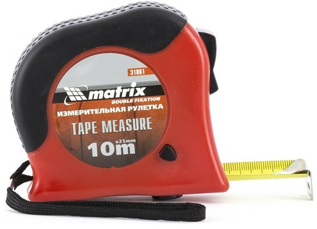 Рулетка 10 м х 25 мм Double fixation MATRIX 31061 имеет ленту длиной 10 метров, что позволяет её использовать для измерения расстояний при строительстве. В устройстве находится два механизма, с помощью которых осуществляется плавная фиксация ленты.