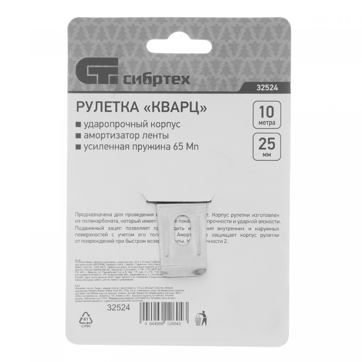 Рулетка Сибртех Кварц 32524 с полотном размером 10 м х 25 мм, в прозрачном корпусе, с амортизатором, будет полезна для измерения длины конструкций, строительных материалов и т.д. Пригодится на строительной площадке, в гараже, мастерской и в быту.