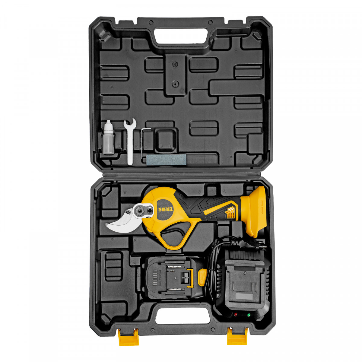 • Расширенная комплектация — секатор поставляется с аккумулятором, зарядным устройством, гаечным и шестигранным ключами, масленкой и точильным камнем.