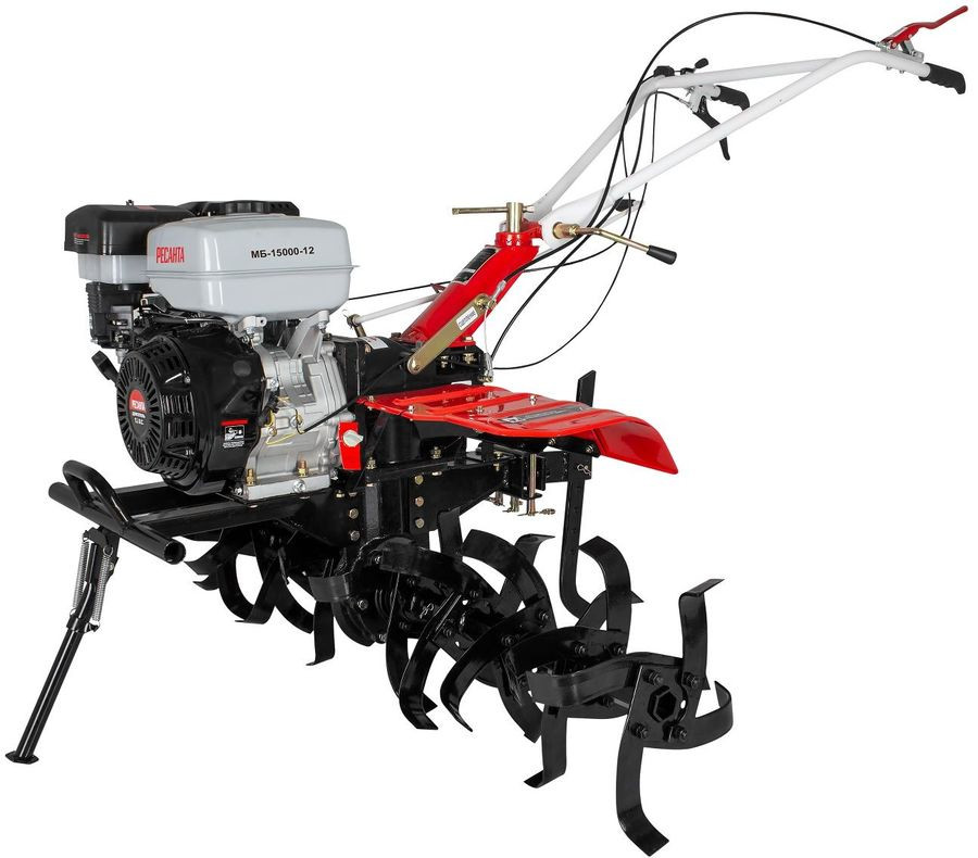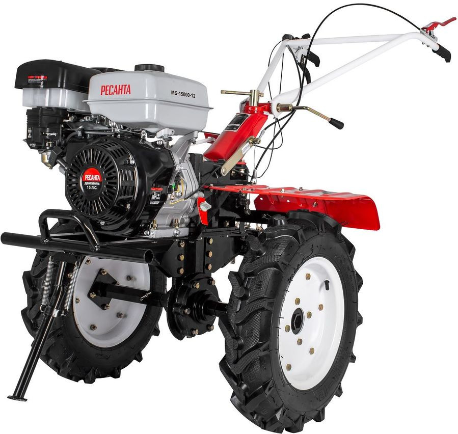 Четырехтактный двигатель мотоблока Ресанта МБ-15000-12 обладает высокой мощностью и надежен при долгой эксплуатации. Благодаря продуманной конструкции мотоблок можно использовать с различным навесным оборудованием. За отличную проходимость по любой почве отвечают мощные колеса.