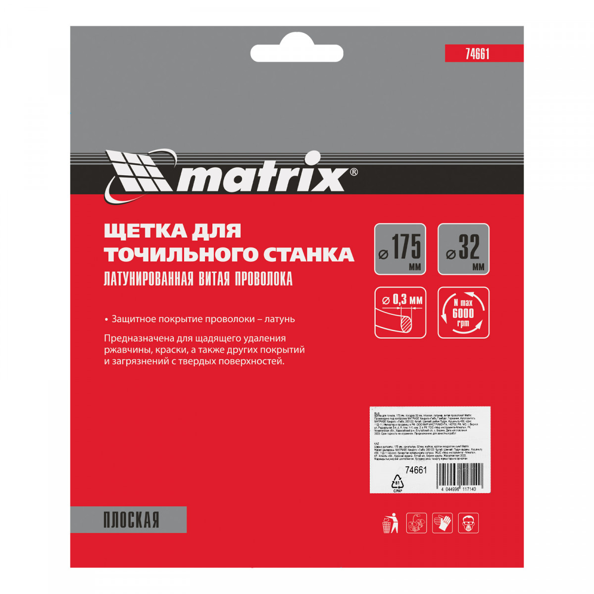 Плоская щетка Matrix 74661 диаметром 175 мм, с щетиной из латунированной витой проволоки, устанавливается на точило с посадочным размером 32 мм. Рекомендуемая скорость вращения — не более 6000 об/мин. Витая проволока позволяет в щадящем режиме зачистить тонкий слой ржавчины и лакокрасочных покрытий, удалить различные загрязнения с небольших или хрупких деталей. Благодаря плоской форме щетка подходит для обработки труднодоступных мест.