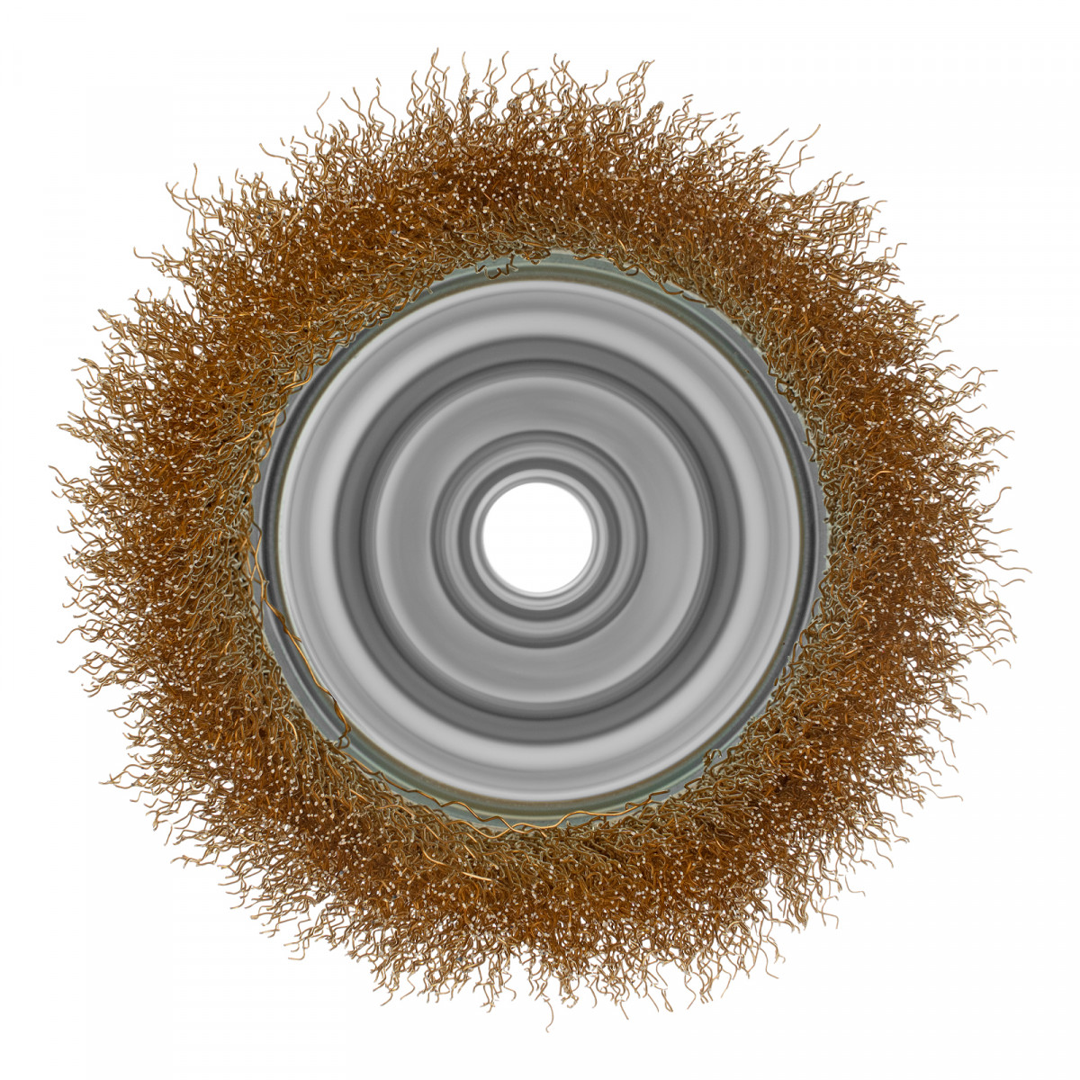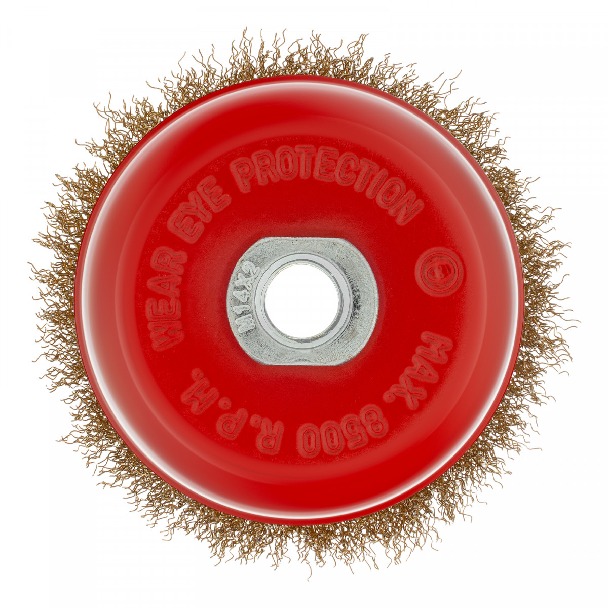 Щетка «чашка» Matrix 74605 диаметром 100 мм, с щетиной из латунированной витой проволоки, устанавливается на вал УШМ с помощью гайки М14. Предназначена для снятия тонкого слоя краски или лака, удаления ржавчины и загрязнений. При рекомендованной скорости вращения 8500 об/мин щеткой можно быстро обрабатывать участки большой площади.