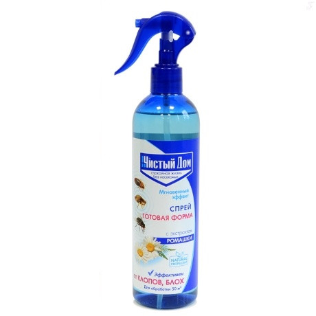 Спрей от клопов, блох, тараканов, мух и других вредных насекомых универсальный Чистый дом - полностью готовый к использованию препарат предназначен для обработки мебели, плинтусов, напольных покрытий и других возможных мест обитания насекомых: клопов, блох, тараканов и мух в периоды их массового появления. Благодаря наличию в препарате сильнодействующего вещества уничтожение насекомых происходит мгновенно (нокдаун эффект); входящие в состав компоненты обеспечивают продолжительную защиту; флакон емкостью 400 мл рассчитан на обработку 50 кв. м. помещений.