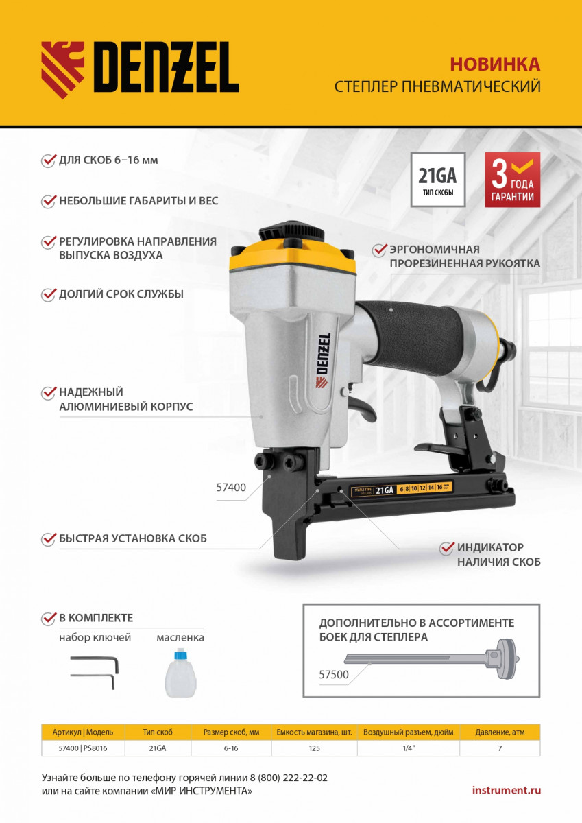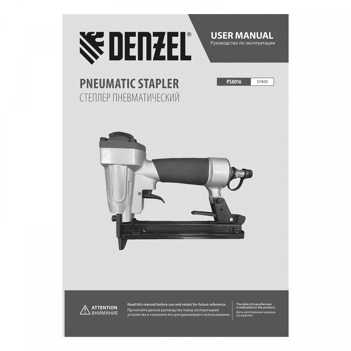 Степлер пневматический PS8016 для прямоугольных скоб 21GA от 6 до 16 мм Denzel