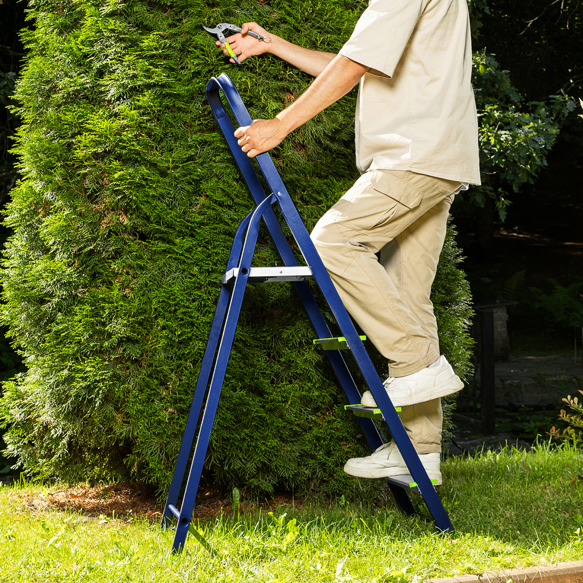 - Надежная конструкция — рама изготовлена из профилированной стали, стальная верхняя площадка с зацепами прочно фиксирует стремянку в рабочем положении.