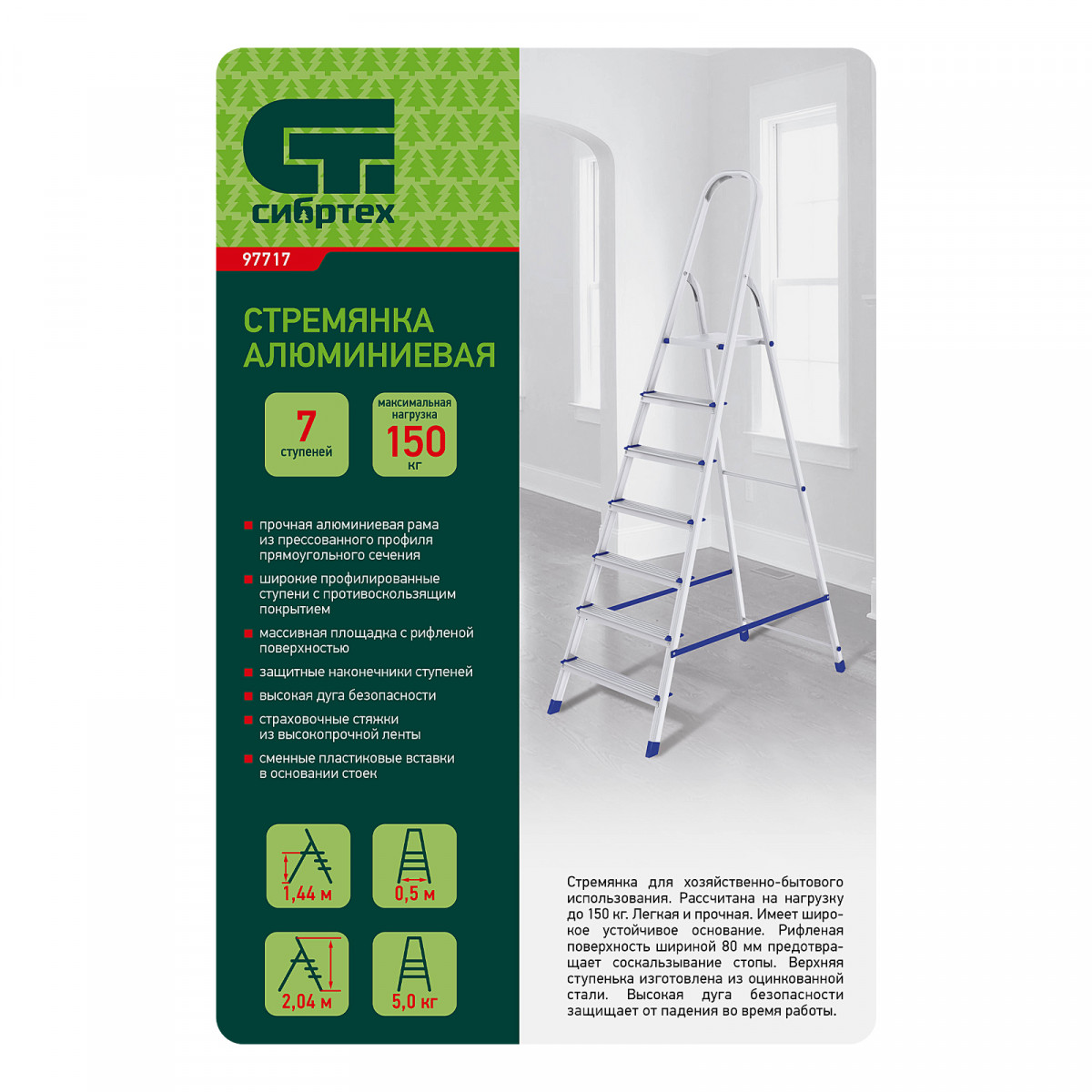 Стремянка алюминиевая Сибртех 97717 с 7 ступенями предназначена для выполнения работ на высоте, превышающей человеческий рост. Высокая дуга безопасности обеспечивает устойчивое положение пользователя. Площадка находится на высоте 144,5 см от опорной поверхности, рабочая высота стремянки составляет 344,5 см (при среднем росте пользователя 170 см). Стремянка пригодится во время строительных и ремонтных работ, позволит без лишних усилий повесить картину или шторы, покрасить стену, достать нужную вещь с антресолей или верхней полки шкафа, а также решить много других бытовых задач.