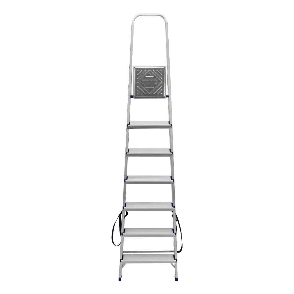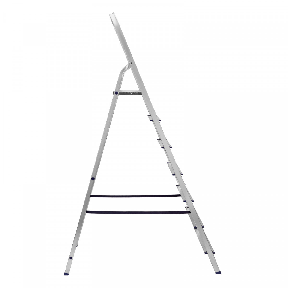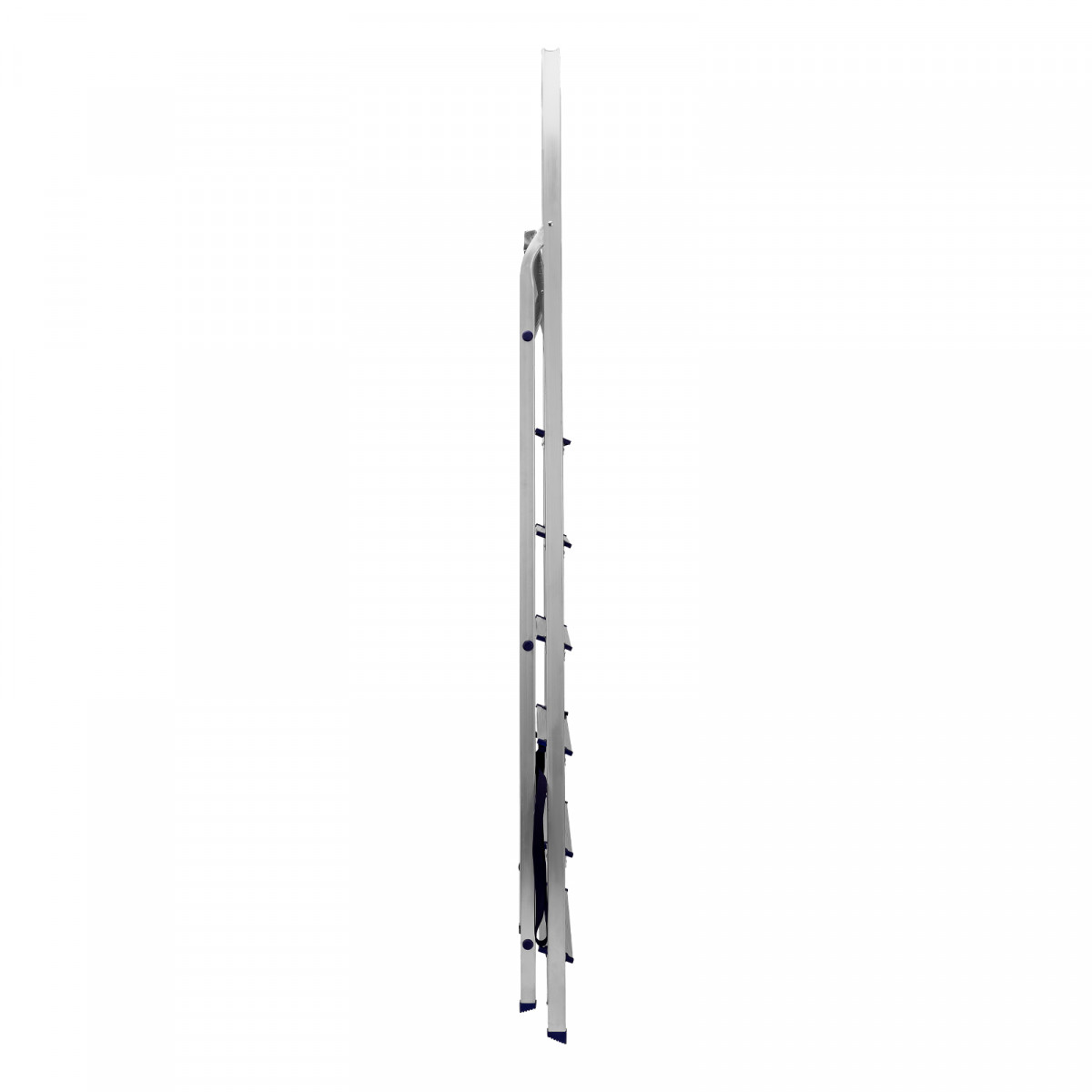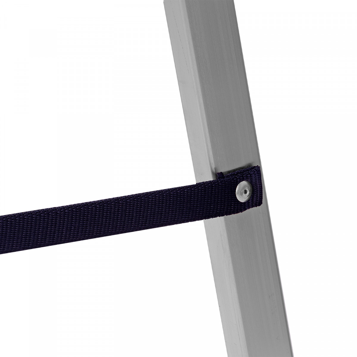 • Надежность — рама из прямоугольного алюминиевого профиля выдерживает нагрузку до 150 кг, широкие ступени закреплены заклепками, страховочные стяжки повышают прочность конструкции.