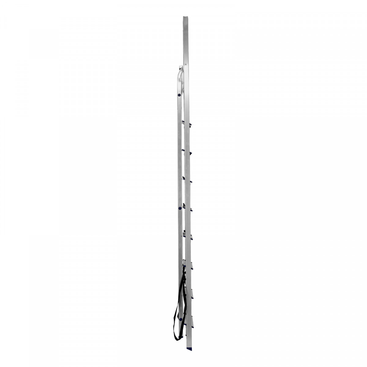 • Надежность — рама из прямоугольного алюминиевого профиля выдерживает нагрузку до 150 кг, широкие ступени закреплены заклепками, страховочные стяжки повышают прочность конструкции.