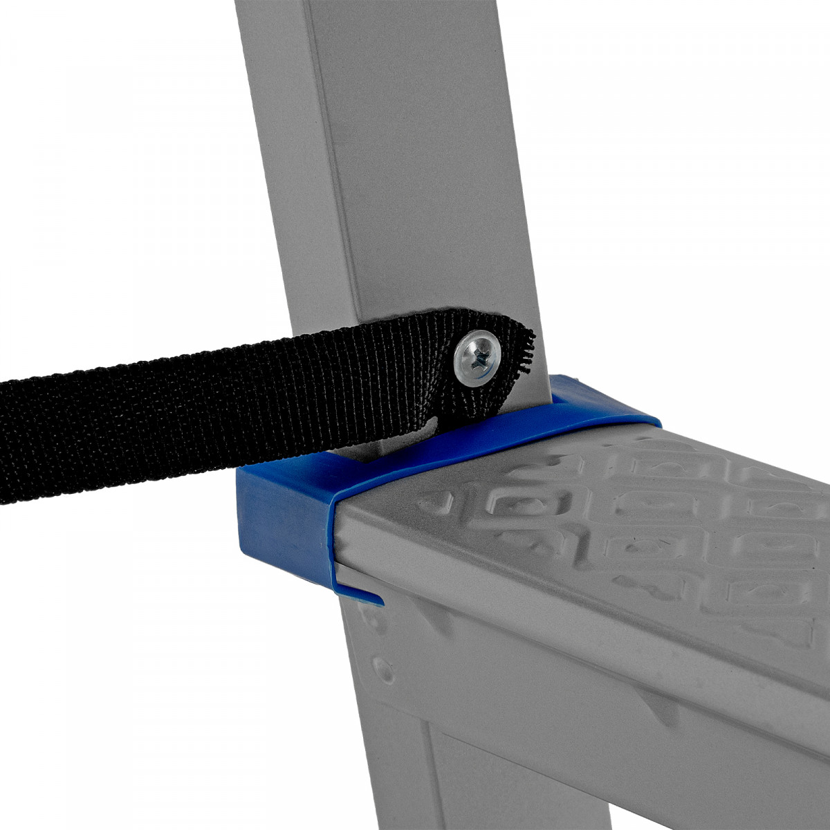 - Надежность — стремянка из стального профиля с широкими ступенями выдерживает вес до 120 кг, страховочные ленты из полиэстера повышают устойчивость.