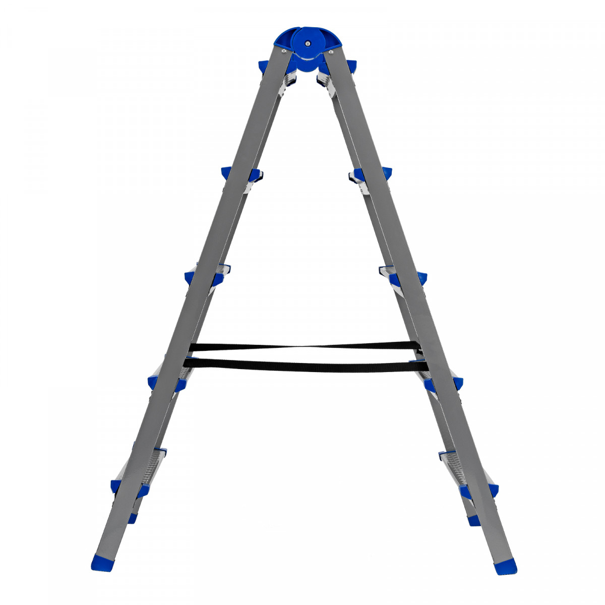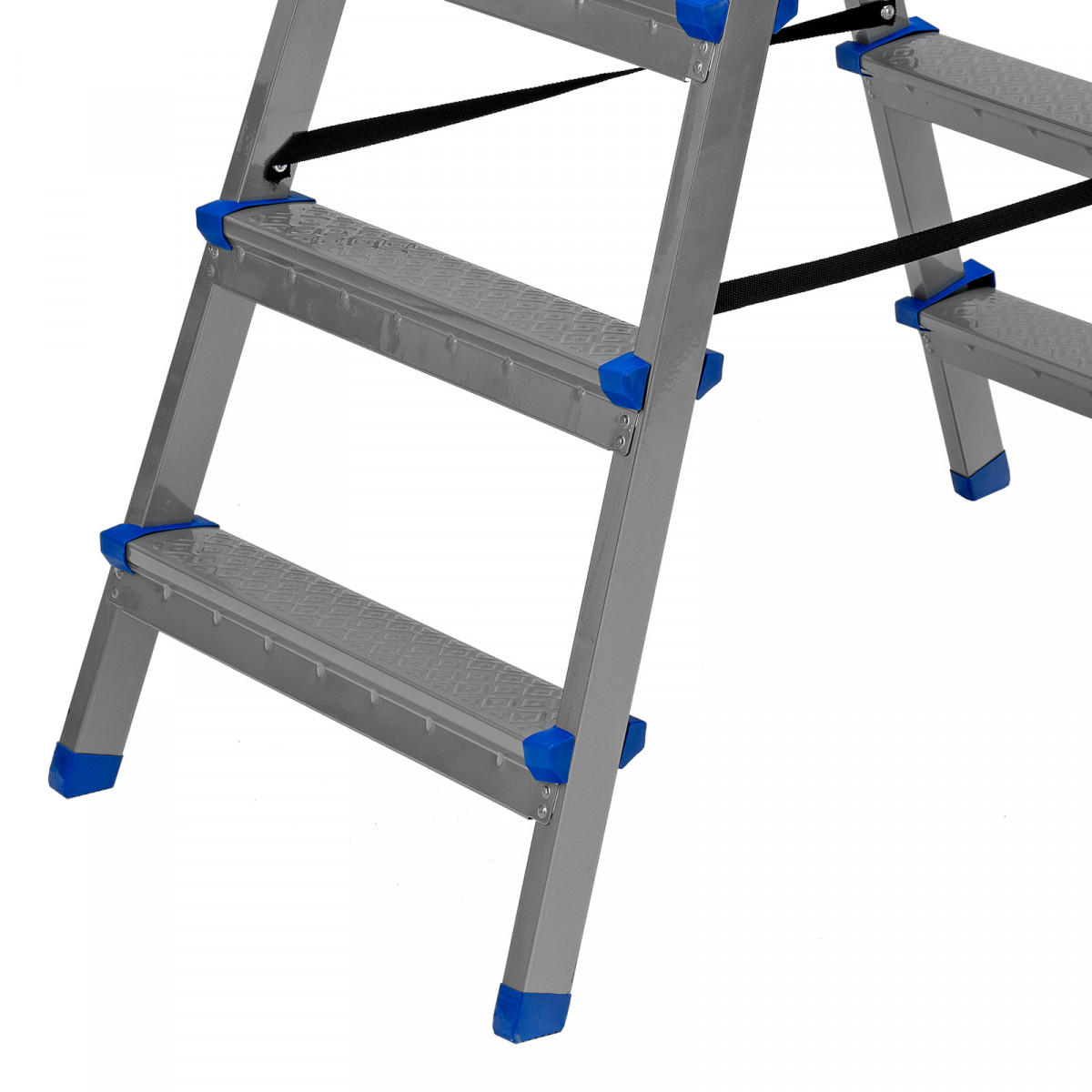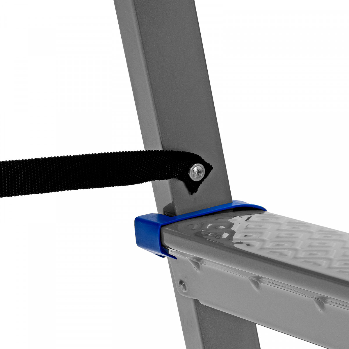 • Надежность — стремянка из стального профиля с широкими ступенями выдерживает вес до 120 кг, страховочные ленты из полиэстера повышают устойчивость.