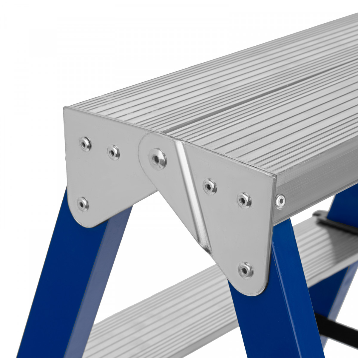 Стремянка двусторонняя стальная Сибртех 97932 с 2 ступенями используется строителями, работниками коммунальных служб, а также полезна в быту. Незаменима, если нужно выполнить монтажные или отделочные работы на высоте, провести уборку, а также достать нужные предметы с антресолей или верхней полки шкафа. На широких ступенях комфортно стоять. Площадка находится на высоте 40,2 см от опорной поверхности, рабочая высота стремянки составляет 240,2 см (при среднем росте пользователя 170 см). Стальная рама прямоугольного сечения выдерживает нагрузку до 150 кг.
