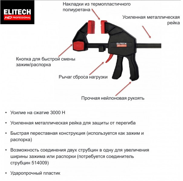 Струбцина быстрозажимная 6"/150.Глубина 90мм. Усилие 300кг ELITECH HD