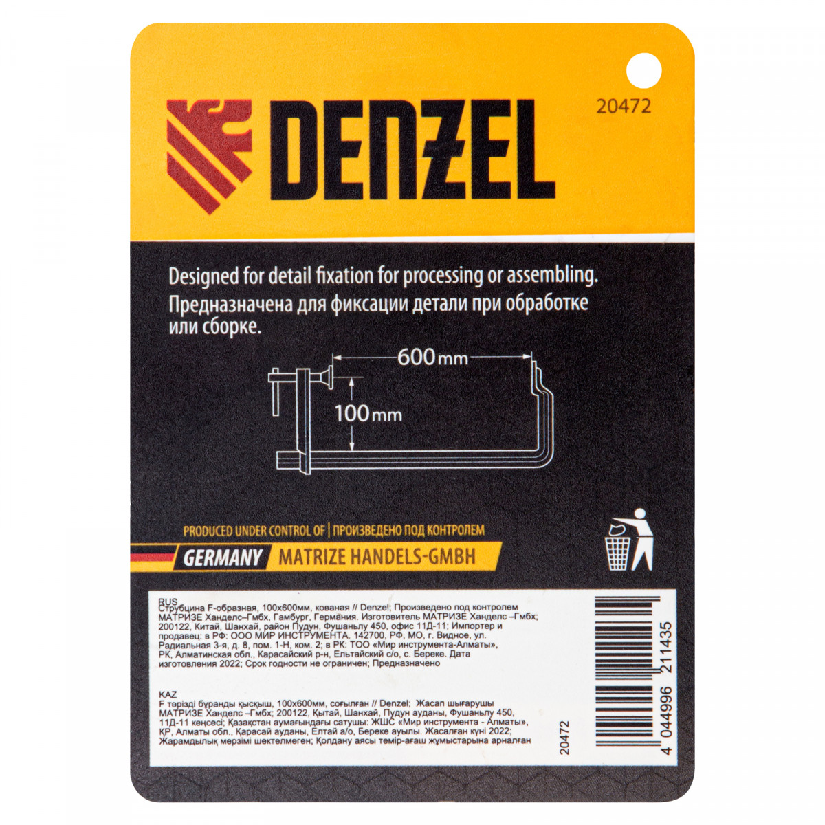 Струбцина F-образная, 100x600мм, кованая Denzel