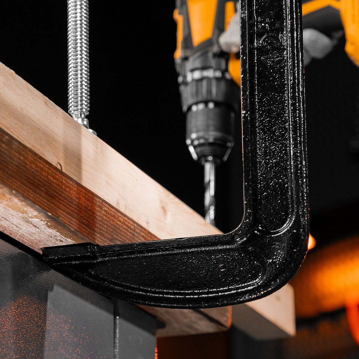 G-образная струбцина Sparta 206715 с шириной зажима 300 мм надежно фиксирует различные детали для дальнейшего склеивания, сверления, пиления, шлифования или сварки. Винт с воротком и крупной червячной резьбой позволяет зажимать детали плавно и со значительным усилием. Струбцина будет полезна домашнему мастеру.
