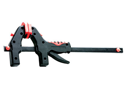 Струбцина изготовлена из ударопрочной пластмассы. Направляющая стальная. Рабочие губки снабжены накладками для предотвращения повреждений обрабатываемых предметов. Опорная губка перемещается и фиксируется по всей длине направляющей при помощи ручки, а также может переставляться на другой конец направляющей, что позволяет использовать струбцину «на разжим».