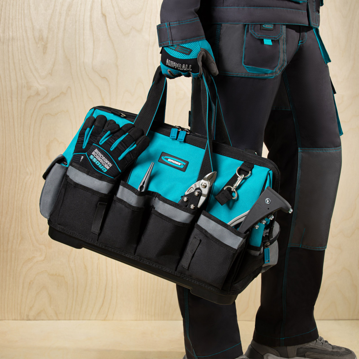 Сумка для инструмента Gross Handwerker 90273 размером 475 х 260 х 360 мм, с 42 карманами, пластиковым дном и наплечным ремнем, будет полезна слесарям, монтажникам, электрикам, а также автомобилистам. В основном отделении, внутренних и внешних карманах поместятся все необходимые инструменты.