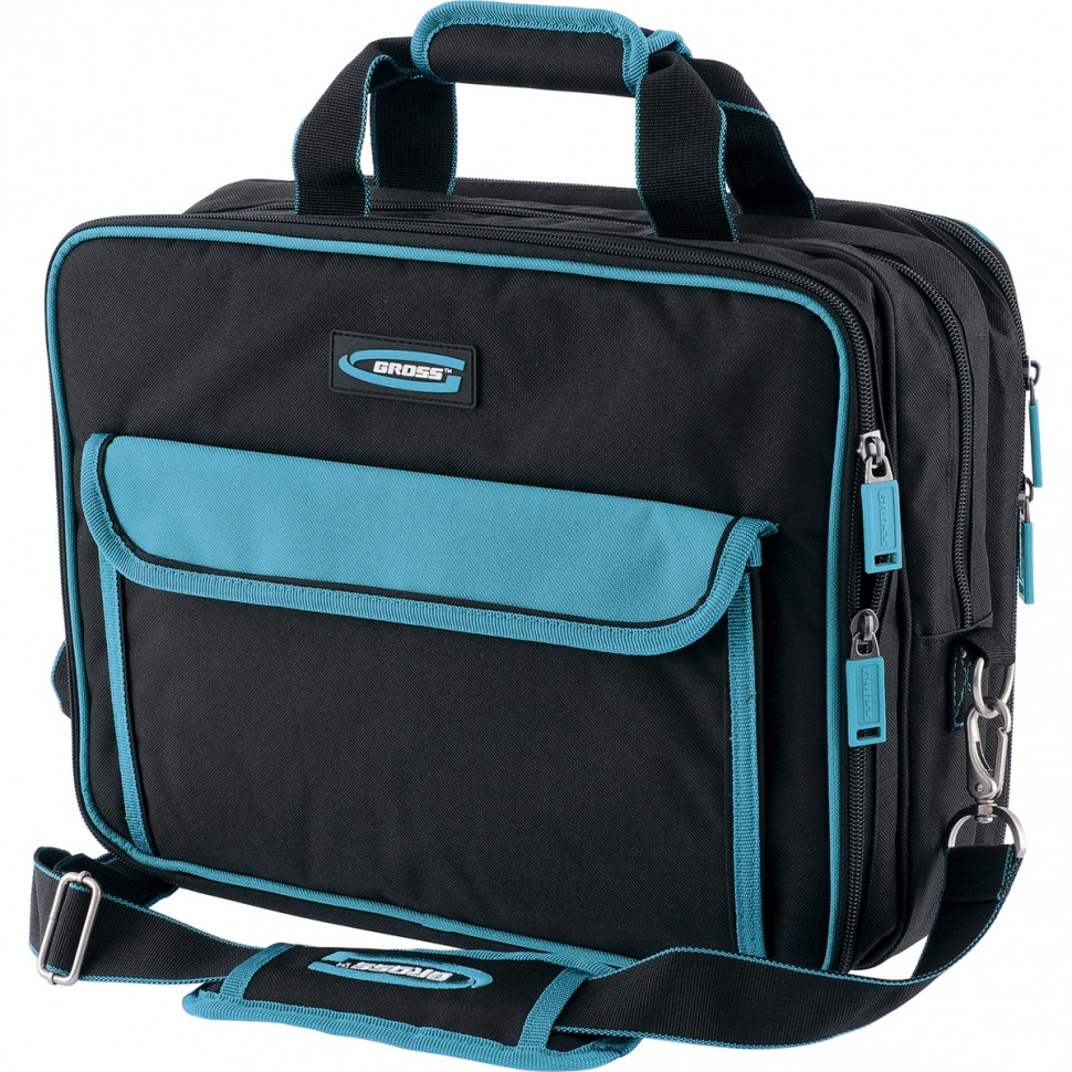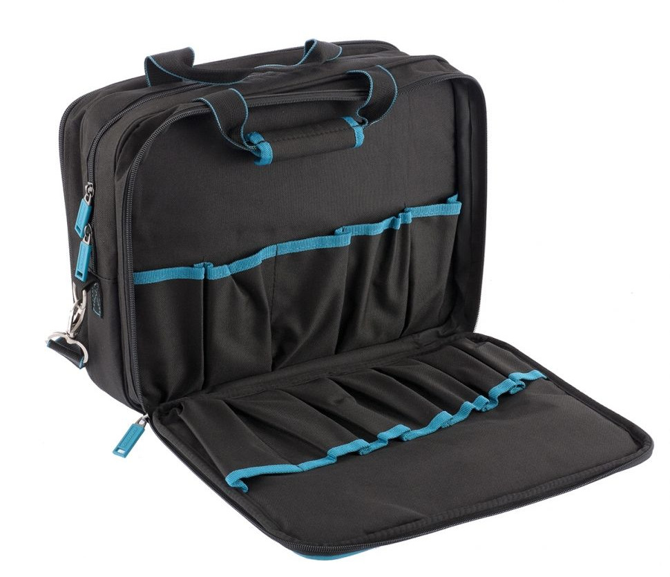 Сумка для инструмента предназначена для переноса и хранения ручного инструмента, документов формата А4, а также ноутбука с диагональю экрана до 15". Множество удобных карманов и прижимных резинок позволяют быстро устанавливать и фиксировать инструменты в сумке. Сумка оснащена удобными рукоятками для переноски, а также наплечным ремнем. Длина сумки 410 мм.