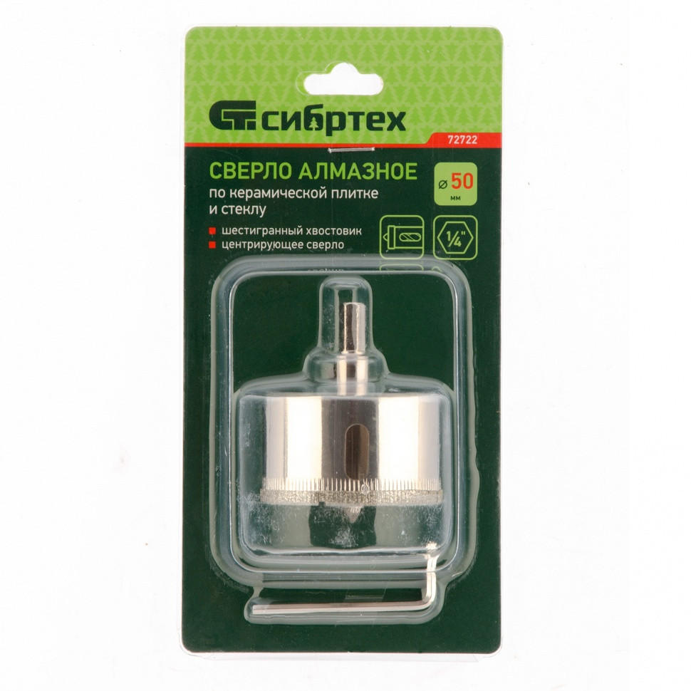 Сверло по керамической плитке и стеклу, 50 х 55 мм, шестигранный хвостовик, с центрующим сверлом Сибртех