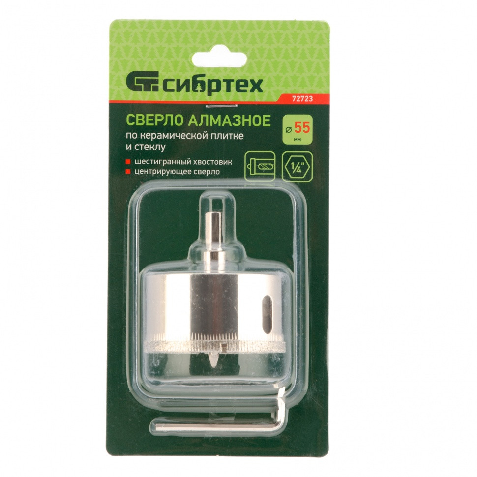 Сверло Сибртех 72723 размером 55 х 55 м, с шестигранным хвостовиком и центрирующим сверлом, позволяет получать отверстия в керамической плитке и стекле. Его устанавливают на дрель или шуруповерт, рекомендуемый диапазон рабочих оборотов 350-700 об/мин. Оснастка используется при выполнении бытовых ремонтных и отделочных работ.