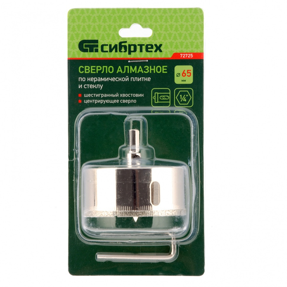 Сверло Сибртех 72725 размером 65 х 55 м, с шестигранным хвостовиком и центрирующим сверлом, позволяет получать отверстия в керамической плитке и стекле. Его устанавливают на дрель или шуруповерт, рекомендуемый диапазон рабочих оборотов 350-700 об/мин. Оснастка используется при выполнении бытовых ремонтных и отделочных работ.