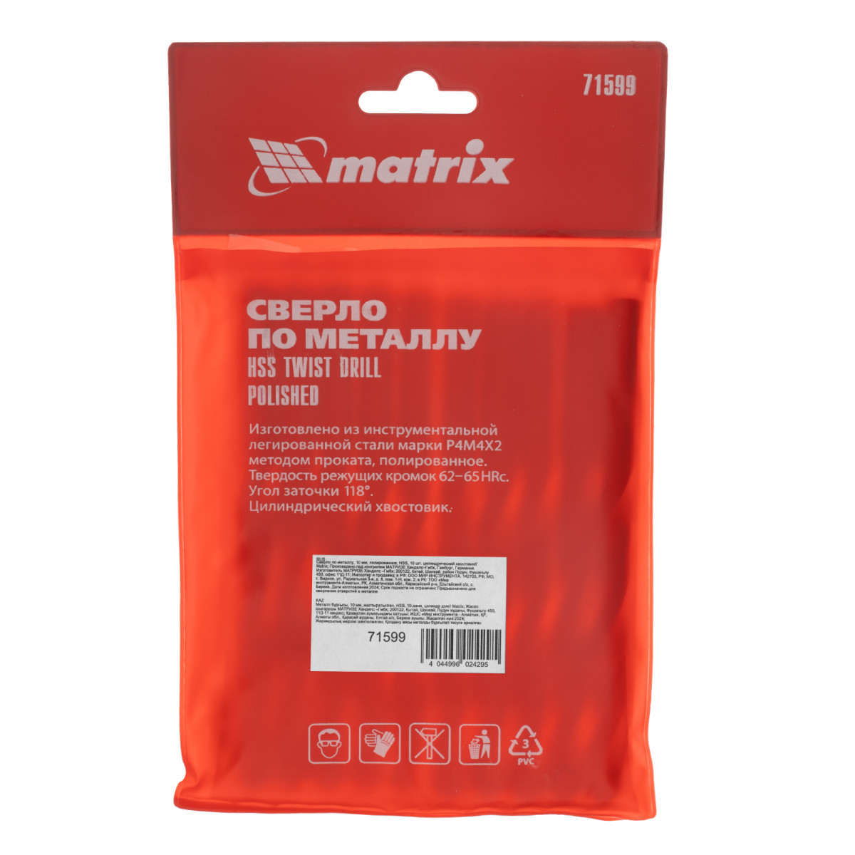 Сверло по металлу, 10 мм, полированное, HSS, 10 шт, цилиндрический хвостовик Matrix