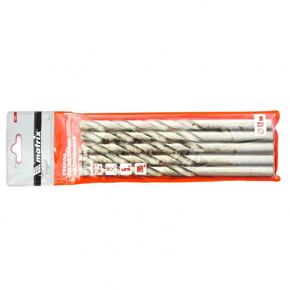 Сверло по металлу, 12 х 205 мм, полированное, удл, HSS, 5 шт, цилиндрический хвостовик Matrix