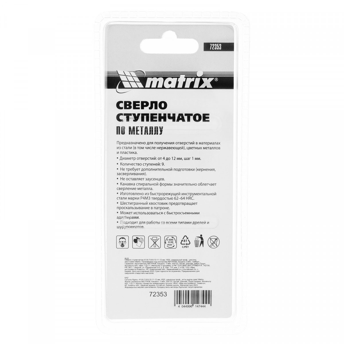 Сверло ступенчатое 4-5-6-7-8-9-10-11-12 мм, HSS, спиральный профиль, шестигранный хвостовик Matrix