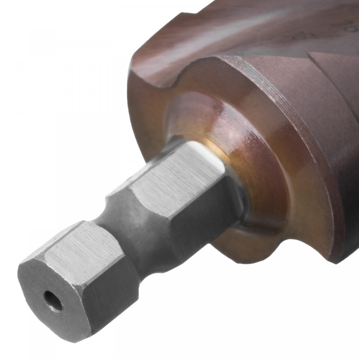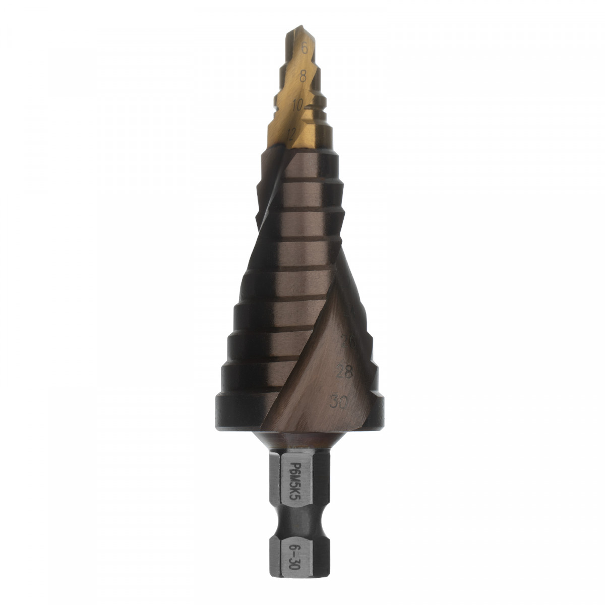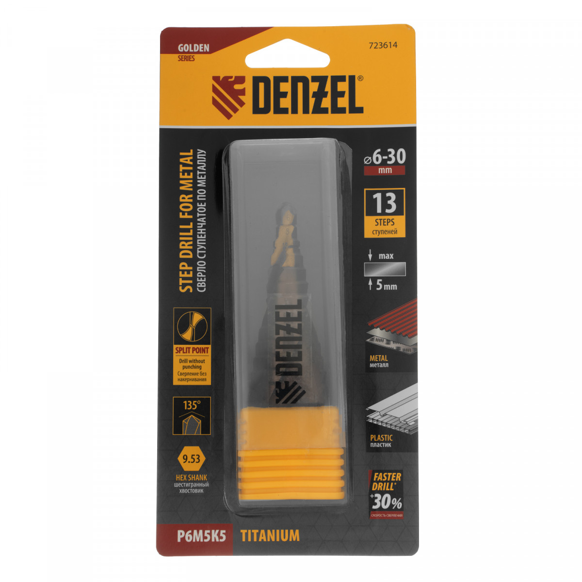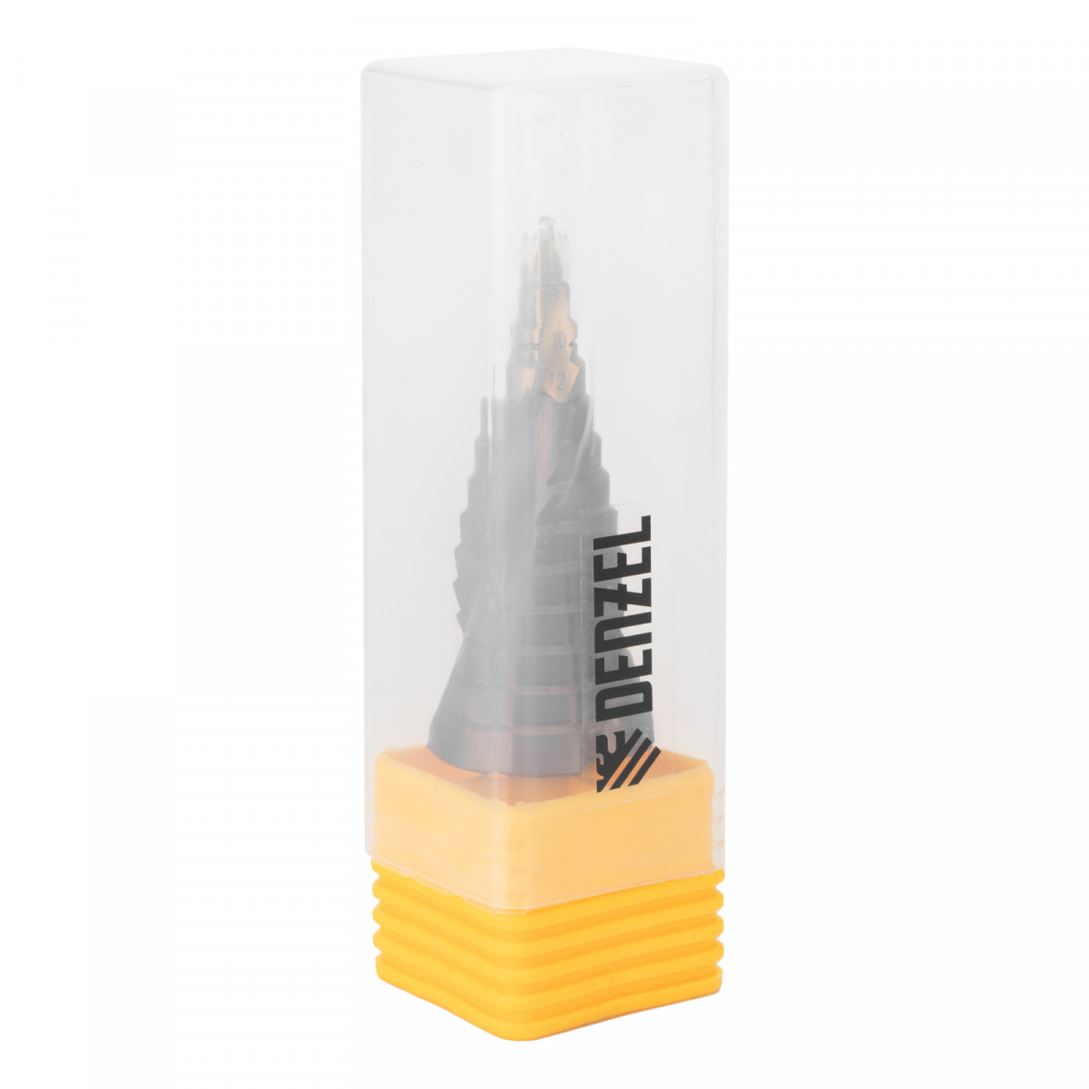 Сверло ступенчатое, 6-8-10-12-14-16-18-20-22-24-26-28-30мм, Р6М5К5, 6-гр. хвостовик Denzel