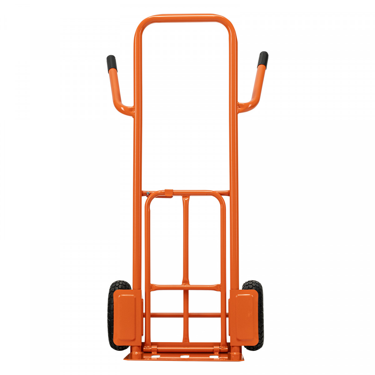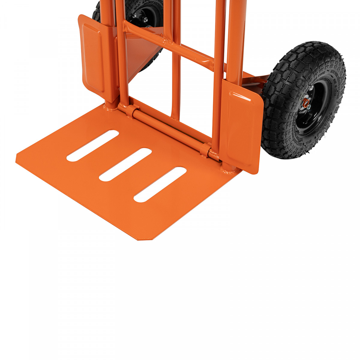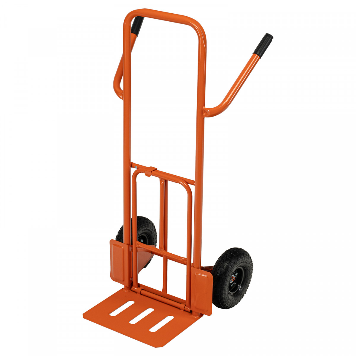 - Удобная транспортировка груза — пневматические колеса с камерами, резиновыми шинами и 2 шарикоподшипниками в каждом гасят вибрации и обеспечивают плавность хода.