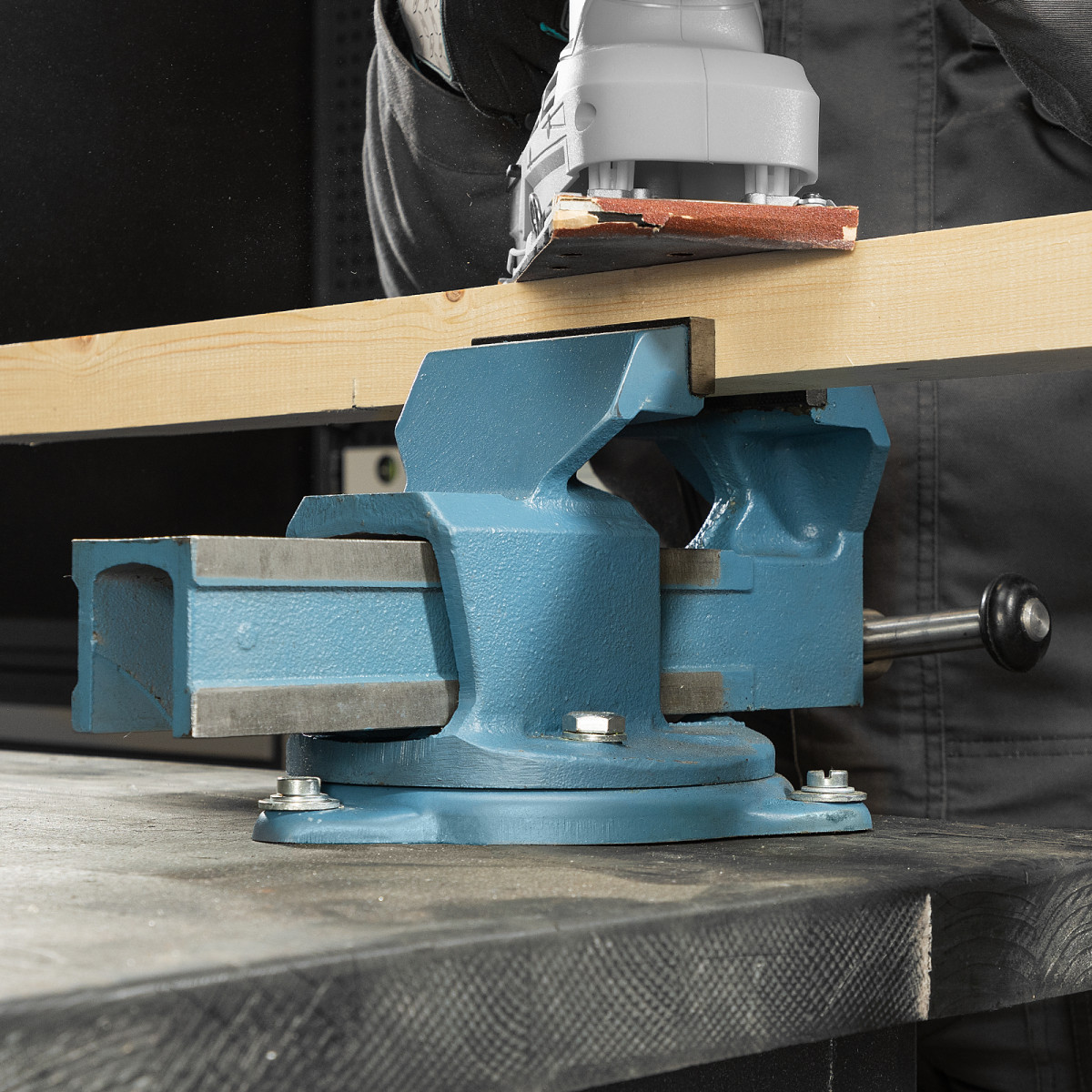 Слесарные тиски 18663, ширина губок 100 мм, с креплением для стола и винтовым зажимом, используются для надежной фиксации заготовок. С их помощью удобно выполнять непрофессиональные столярные и слесарные работы. Тиски с рабочим ходом 140 мм рассчитаны на удержание крупных заготовок.