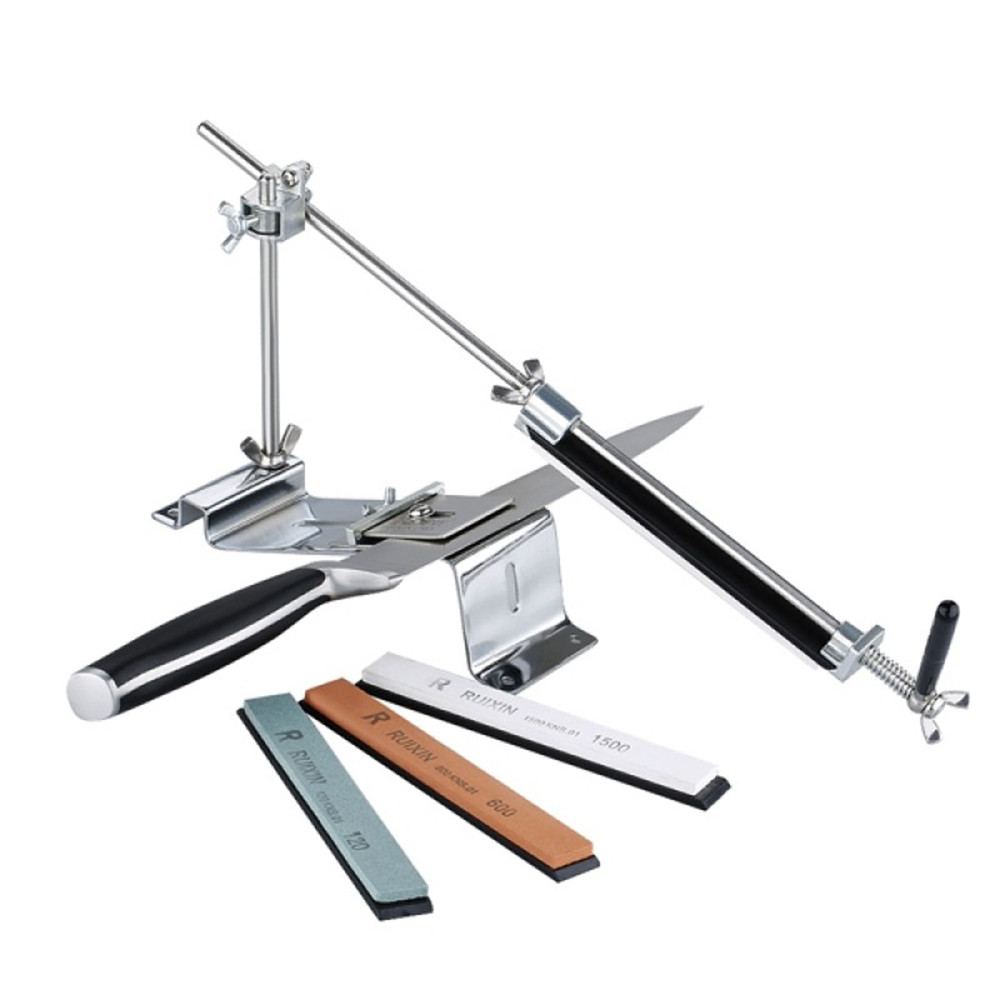 Модель точилки Ruixin PRO III представляет собой фактически копию популярной точилки Edge Pro. Изделие полностью металлическое, в составе – никелированное железо. Основание точильного приспособления можно прикрепить к столешнице болтами, а можно просто установить на поверхность стола и фиксировать при работе рукой. Станок для заточки состоит из нескольких частей, в разобранном состоянии он имеет небольшие габариты и удобен для переноски. В набор включены сразу четыре заточных камня, каждый из которых имеет пластиковую подложку. Бруски можно достаточно быстро зафиксировать на направляющей и поочередно менять для эффективности затачивания. Зернистость брусков составляет 120, 320, 600 и 1500 грит. Разработчики советуют выполнять обработку лезвия плавно, движениями «от себя», не надавливая на клинок до появления заусенца. Кроме ножей, используя эту модель, также можно наточить ножницы, строительные или сельскохозяйственные инструменты. Также можно обрабатывать и иные изделия, которые требуют подобного ухода. Пользователь может выбрать самостоятельно угол заточки лезвия, за счёт чего удаётся хорошо обработать разные ножи. Как толстые охотничьи, так и модели для туристов, а также тонкие и изящные филейные ножики. Вес точильного приспособления составляет 845 грамм.