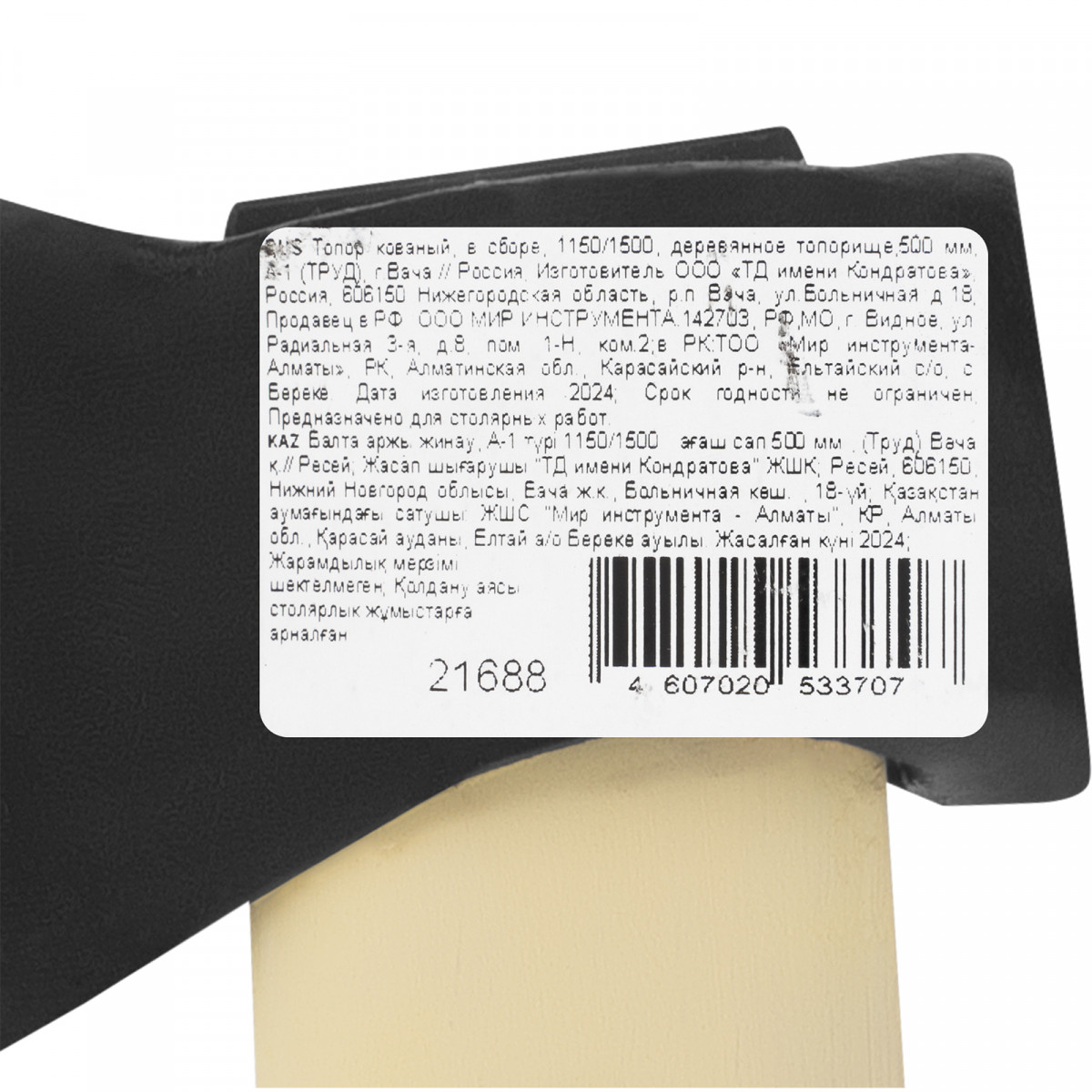 Кованый топор А-1 Труд 21688 с рабочей частью весом 1150 г и деревянным топорищем длиной 500 мм, весит в сборе 1500 г и предназначен для рубки древесины средней толщины. Подходит также для выполнения более тонких работ, например, тесания заготовок. Пригодится на дачном участке или в частном доме.