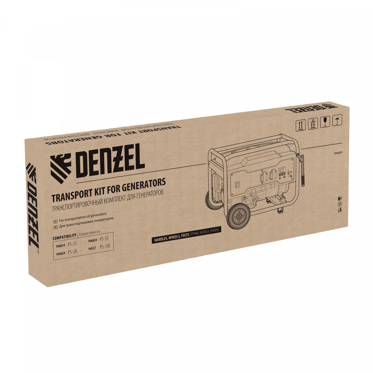 Транспортировочный комплект Denzel 94669, включающий 2 колеса и 2 ручки, совместим с генераторными установками Denzel PS-25, PS-28, PS-33, PS-33E (артикулы 946814, 946824, 946834, 94537). Предназначен для перемещения генератора по рабочей площадке.