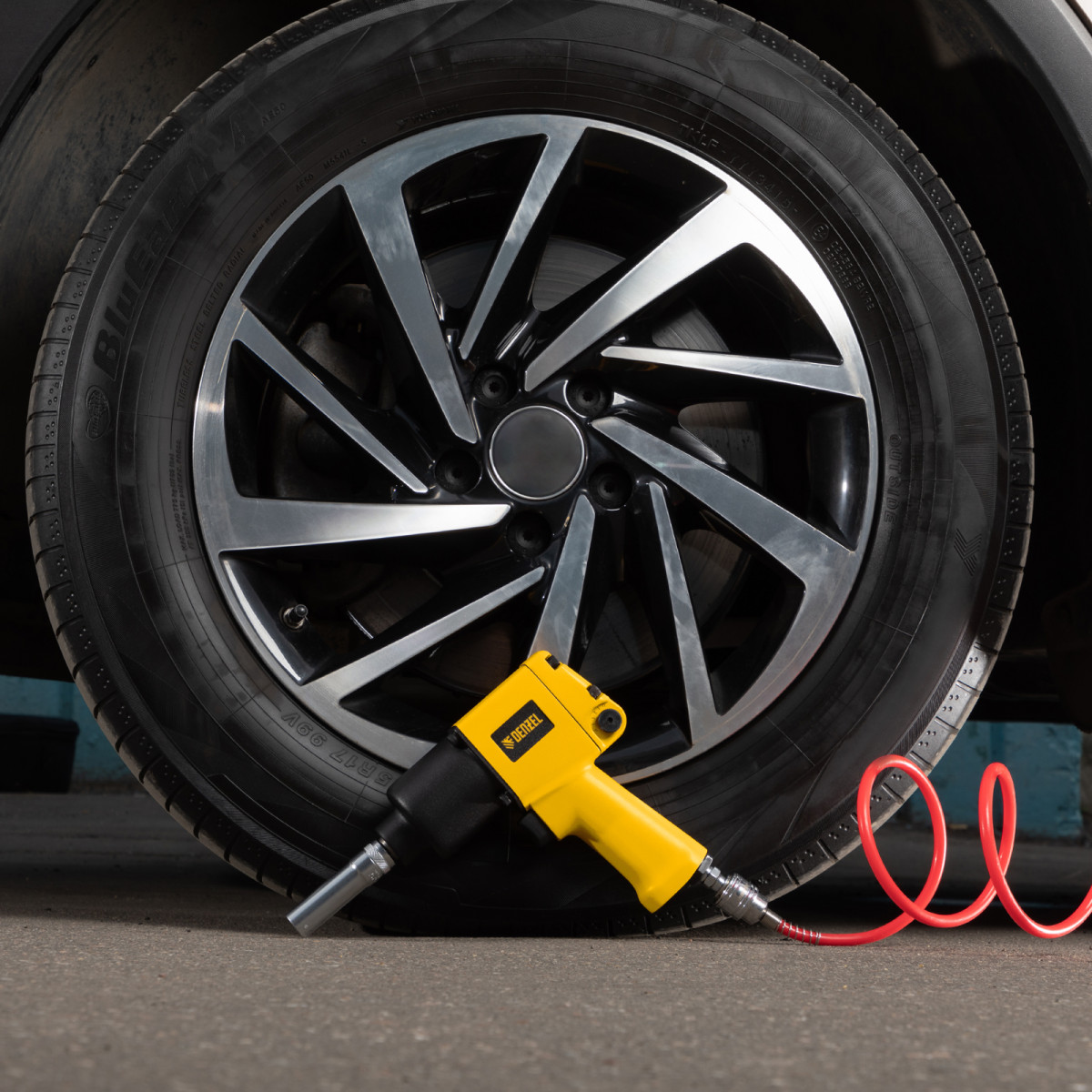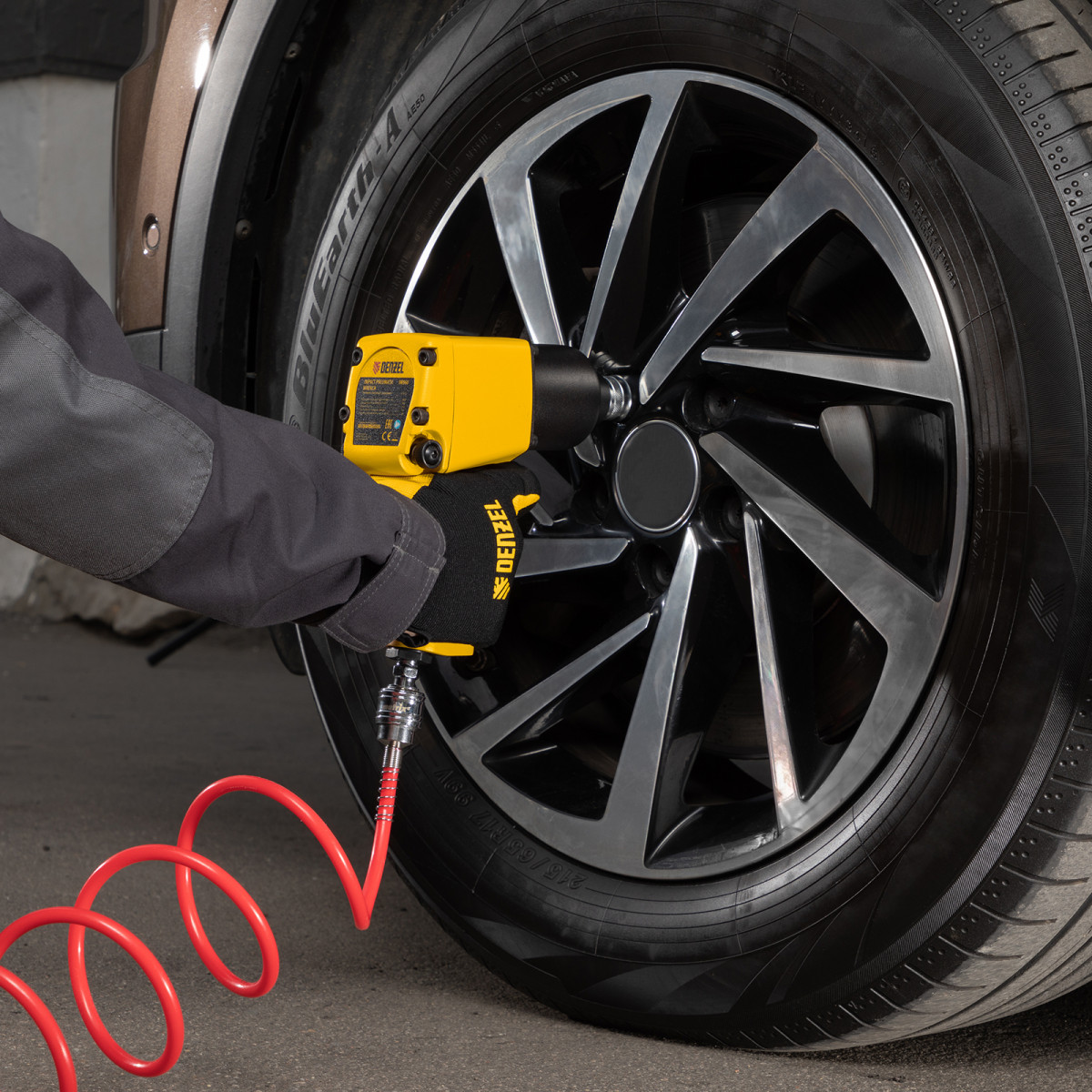 - Продуманная комплектация — штуцер для подключения к компрессору прилагается к гайковерту, его не нужно приобретать отдельно.