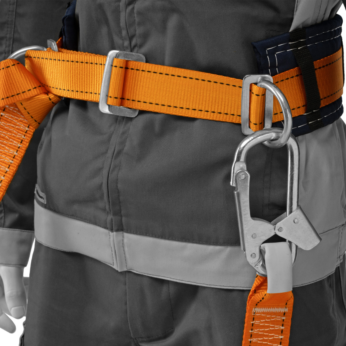 - Надежная страховка — привязь снабжена большим карабином и двумя прочными металлическими D-образными кольцами.