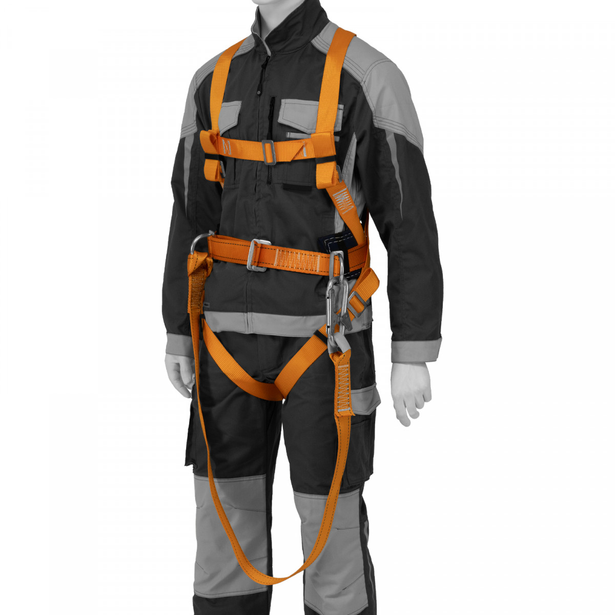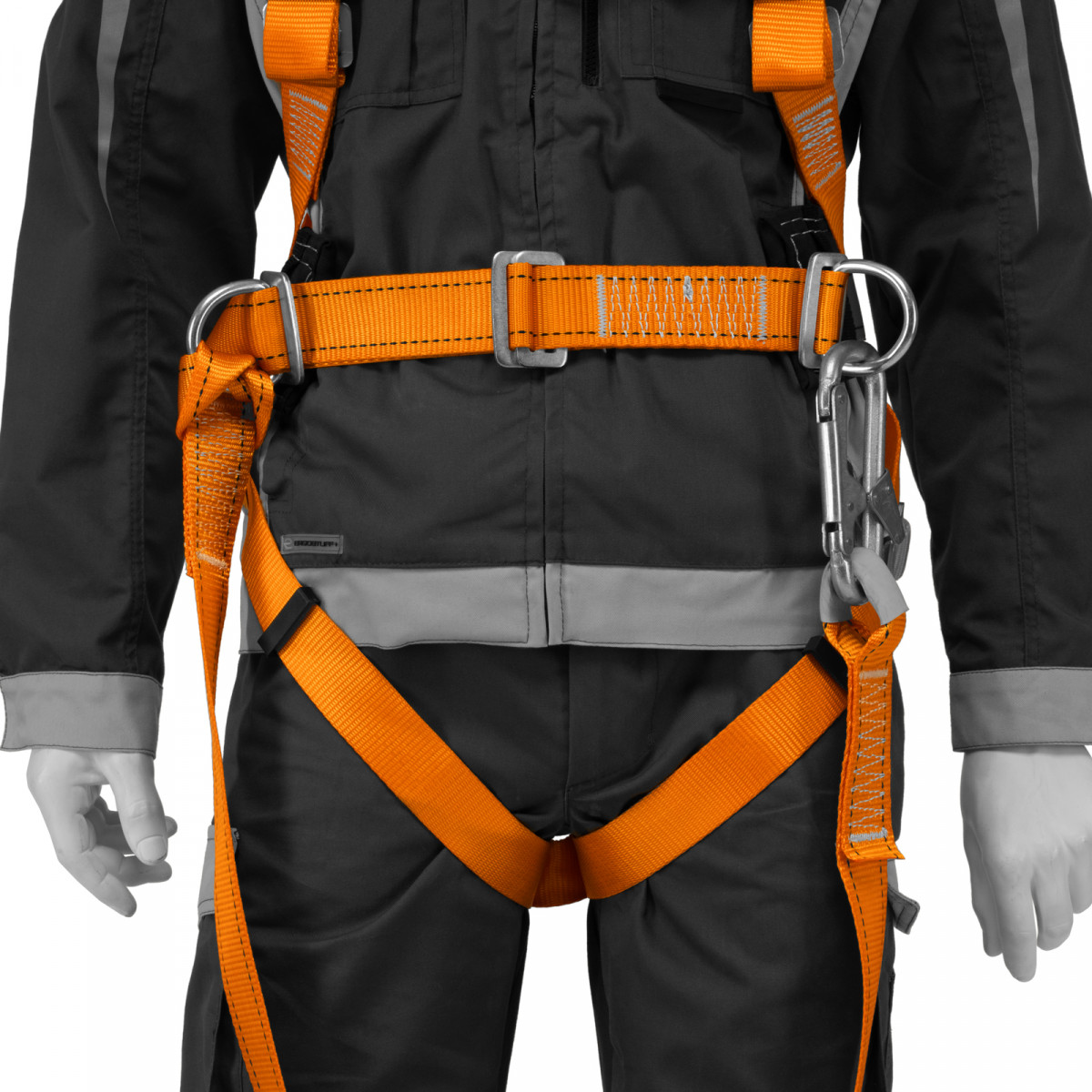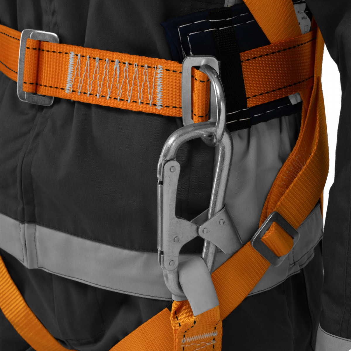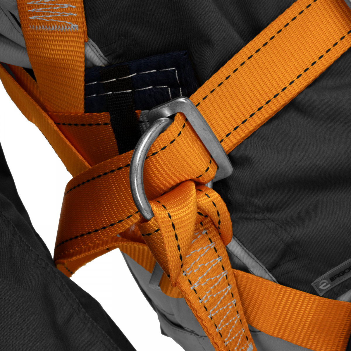 - Надежное крепление — привязь имеет 2 прочных D-кольца на поясном ремне и одно на спине, а также большой монтажный карабин.