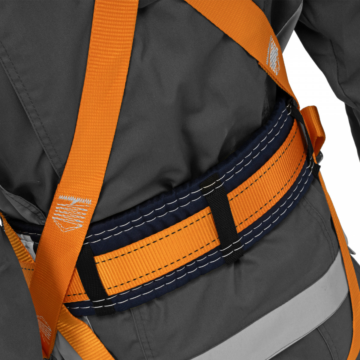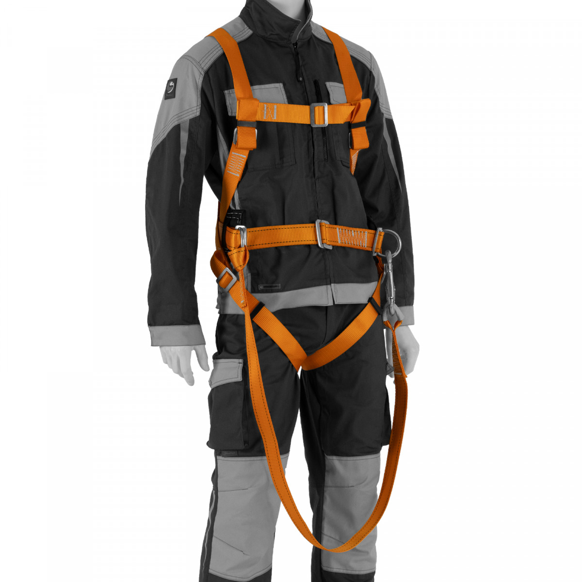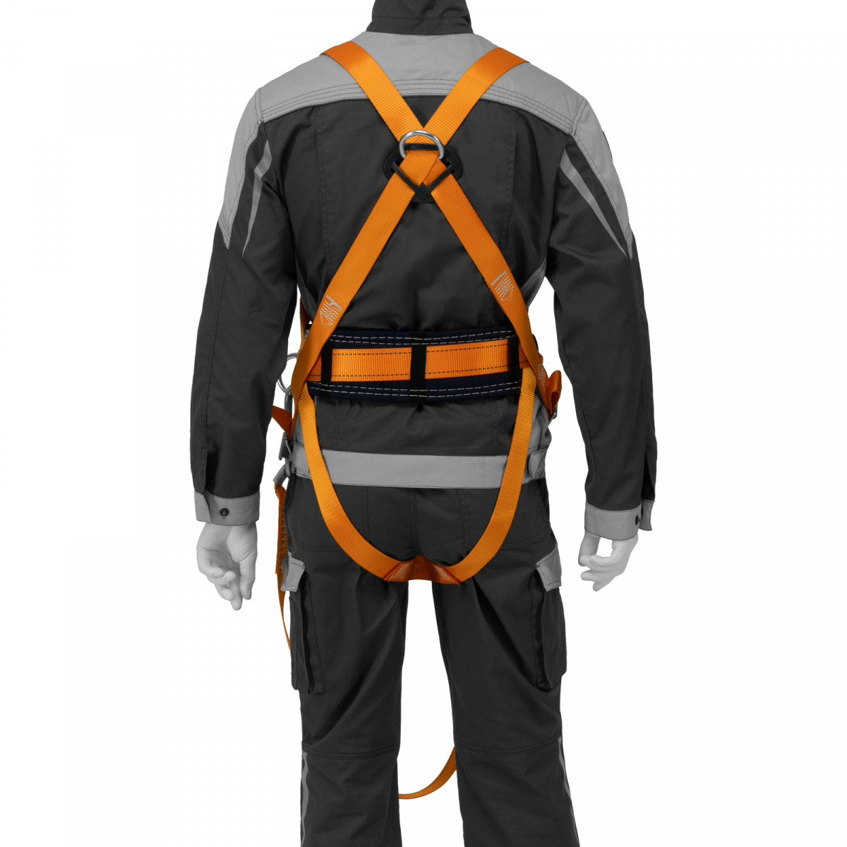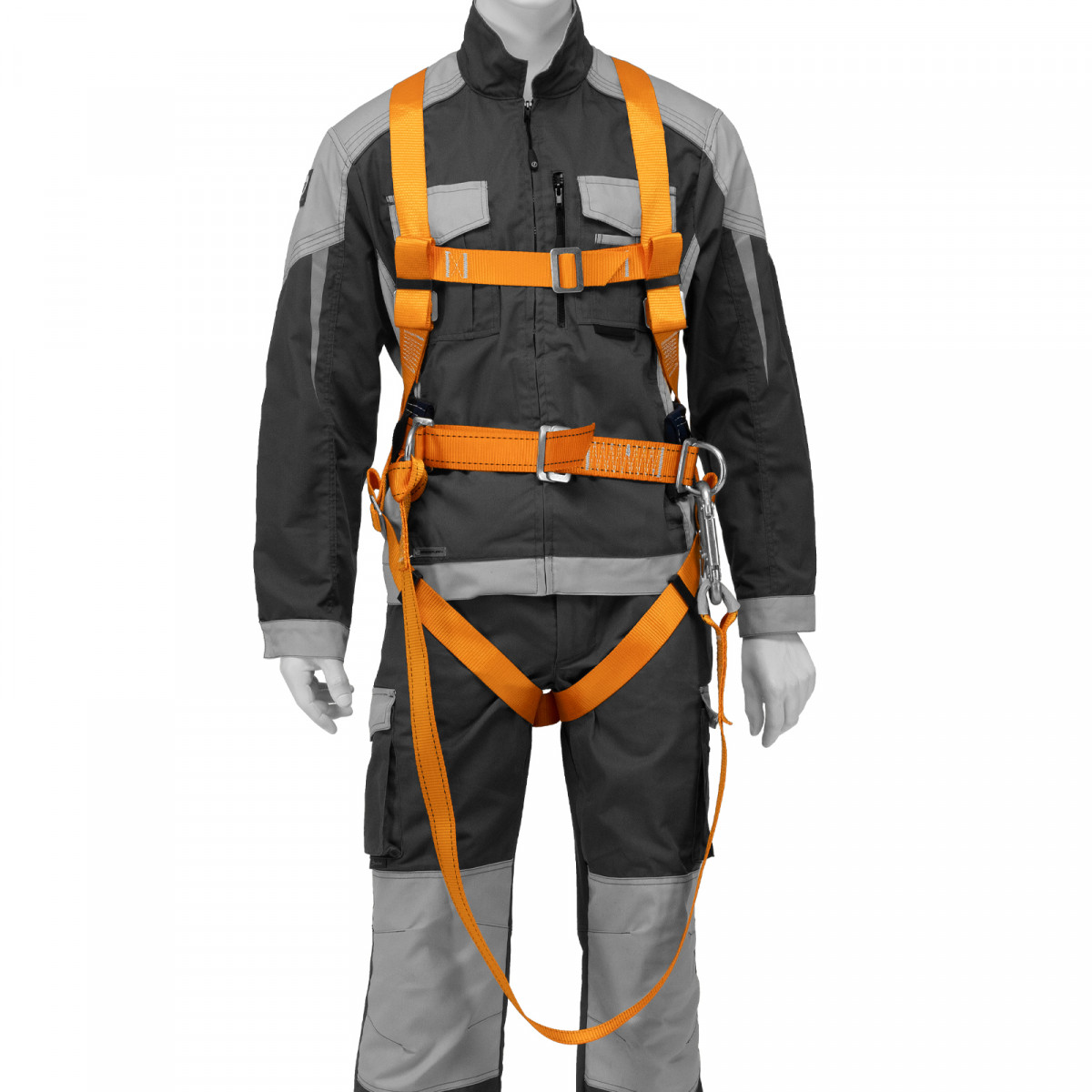 - Надежное крепление — привязь имеет 2 прочных D-кольца на поясном ремне и одно на спине, а также большой монтажный карабин.
