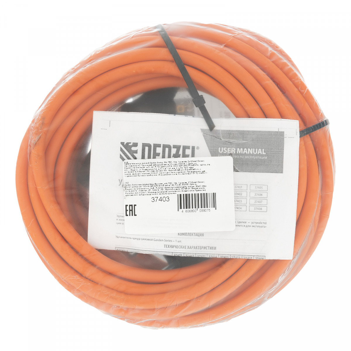 Силовой удлинитель-шнур Denzel Garden Series 37403 с кабелем ПВС сечением 2 x 1,5 мм и 1 розеткой без заземления, позволяет подключать приборы к электросети на расстоянии до 10 м от стационарного источника питания. Максимальная мощность потребителя составляет 4400 Вт при полностью размотанном кабеле и 2200 Вт — при смотанном. Удлинитель может использоваться при температуре от +5 до +35 °C. Пригодится дома, на даче, в гараже.