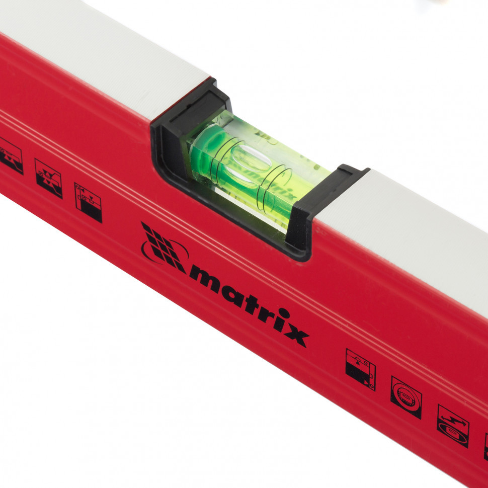 Уровень алюминиевый магнитный Matrix 34720 усиленной конструкции, длиной 2000 мм, с фрезерованной рабочей поверхностью, оснащен 3 глазками и одним зеркальным отражателем. Позволяет выявить отклонения от вертикали, горизонтали и угла 45°. Встроенный зеркальный глазок облегчает считывание показаний.