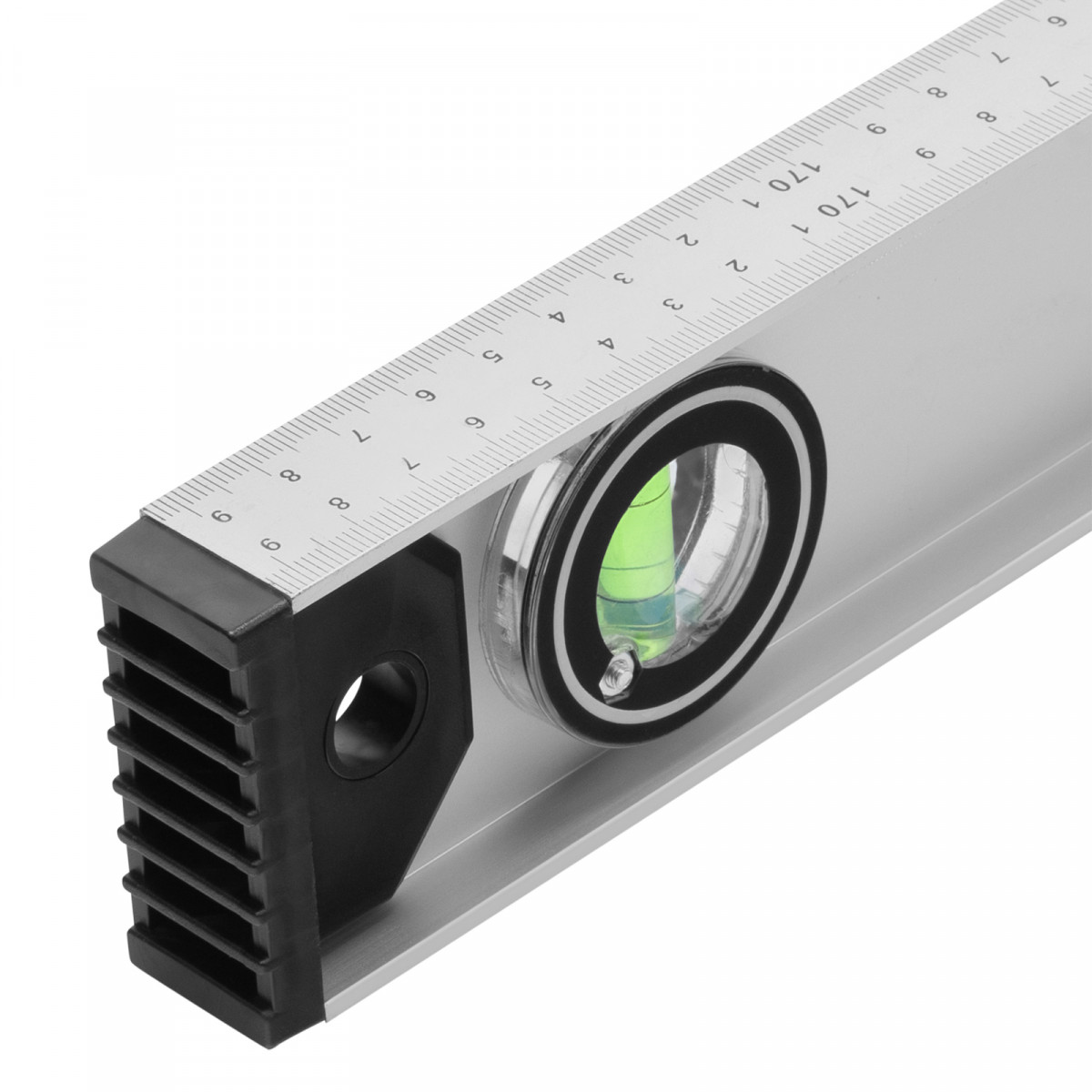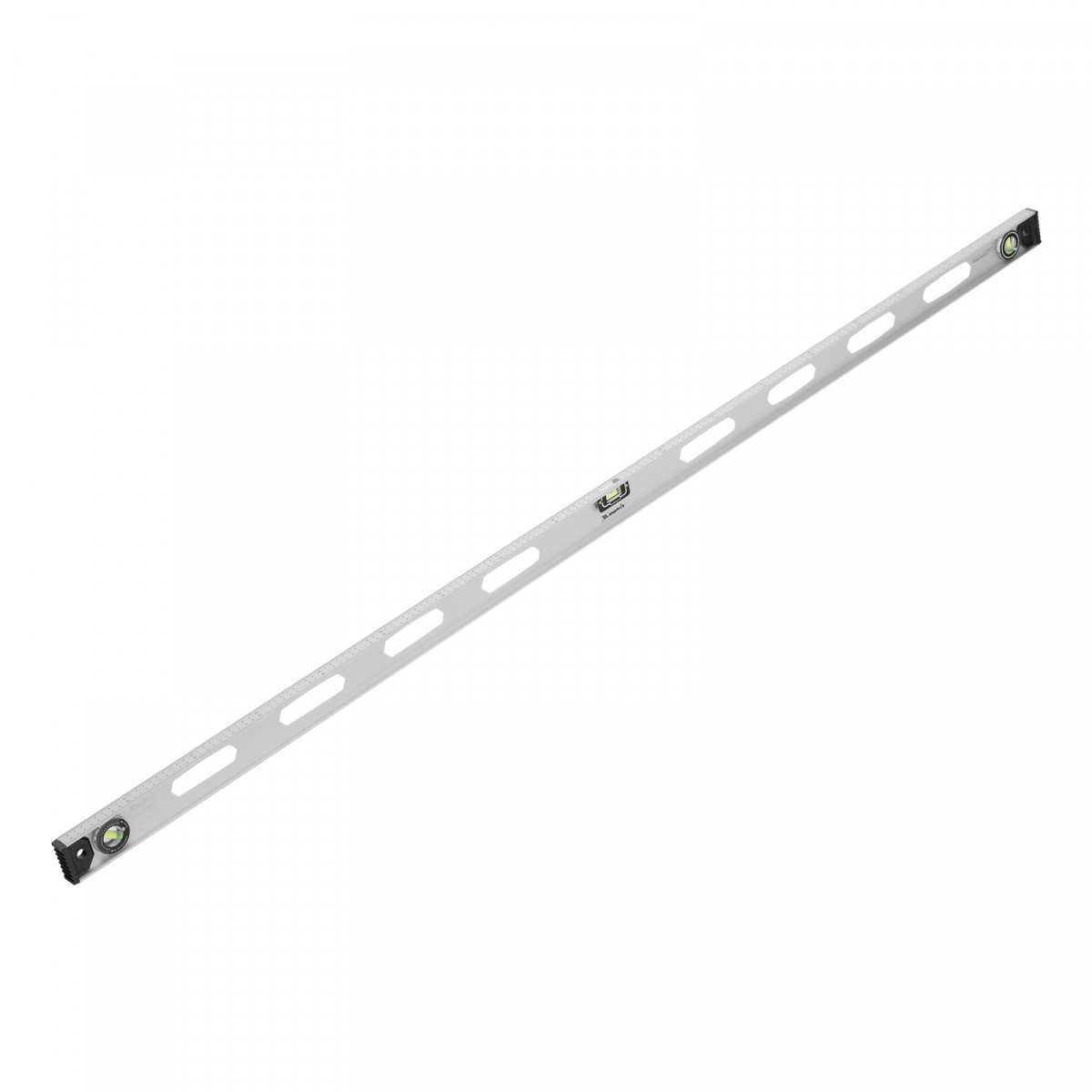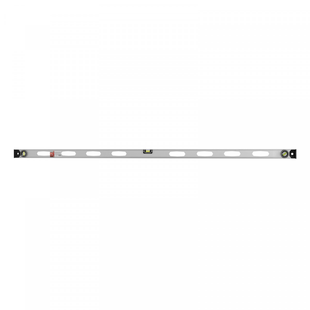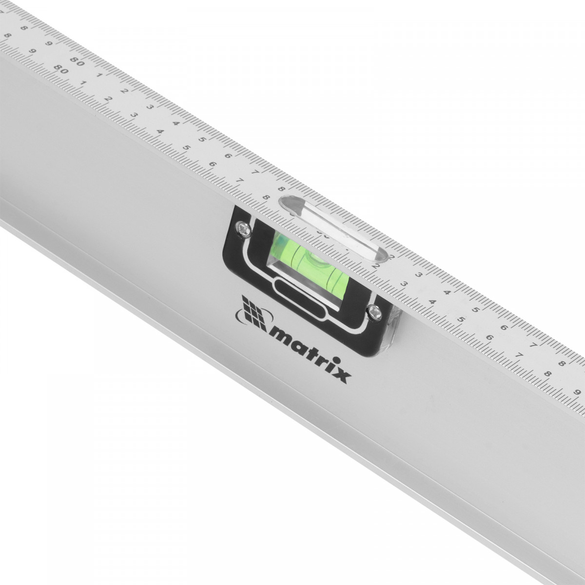Алюминиевый уровень Matrix «Рельс» 34038 длиной 1800 мм имеет 3 глазка: 2 для проверки отклонений от заданной вертикали и горизонтали и 1 поворотный для проверки наклонных поверхностей.