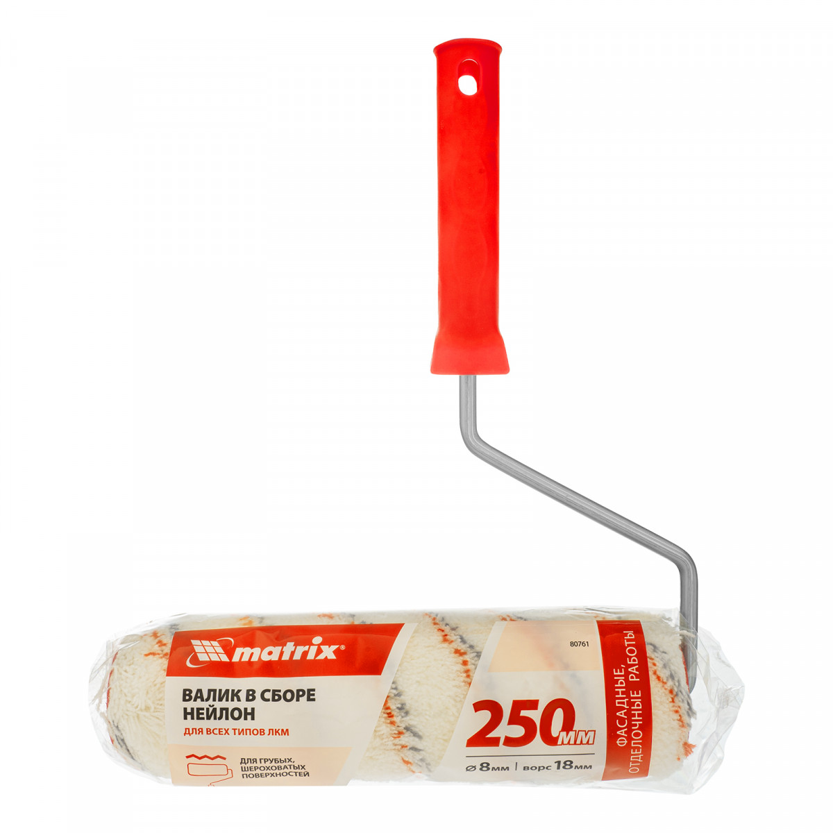 Валик Matrix 80761 «Нейлон Люкс» 250 мм с полиамидным ворсом длиной 18 мм, ручкой диаметром 8 мм, диаметром ролика 48 мм, предназначен для нанесения любых типов лакокрасочных материалов на грубые неровные поверхности. Ширина 250 мм позволяет эффективно и быстро окрашивать большие площади: стены, потолки, фасады и т.д. За счет длины 18 мм ворс прокрашивает самые труднодоступные места, обеспечивая высокое качество окраса.