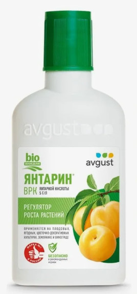 Янтарин Август (янтарная кислота для растений) - это природный регулятор роста для плодово-ягодных и цветочно-декоративных культур. Позволяет активизировать жизнедеятельность растений, ускорить цветение и созревание плодов, повысить урожайность. Культуры, обработанные препаратом Янтарин, становятся более устойчивыми к болезням и неблагоприятным условиям – недостатку или избытку воды, заморозкам, перепадам температуры. Нормализуется микрофлора почвы, в тканях накапливается меньше нитратов. Механизм действия: основным активным веществом препарата является янтарная кислота, улучшающая метаболизм клеток и газообмен в тканях. Ускорение процессов обмена приводит к тому, что растение получает больше энергии и развивается быстрее. Эффективное природное средство для стимуляции роста и развития всех видов растений. Уникальный препарат для реанимации цветочных культур. Улучшает усвоение питательных веществ из почвы. Янтарин идеально подходит для комнатных растений.