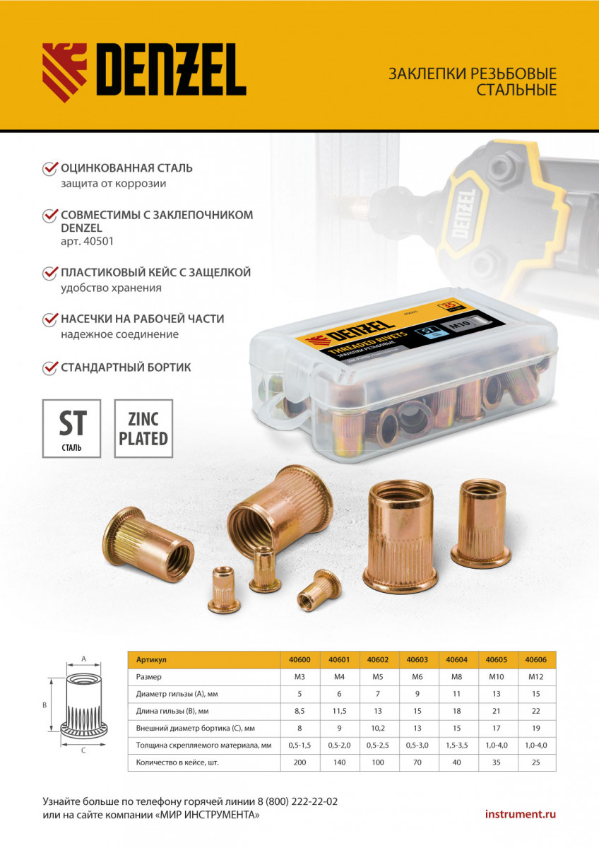 Заклепки резьбовые, стальные, оцинкованные, М12, пластиковый кейс, 25 шт. Denzel